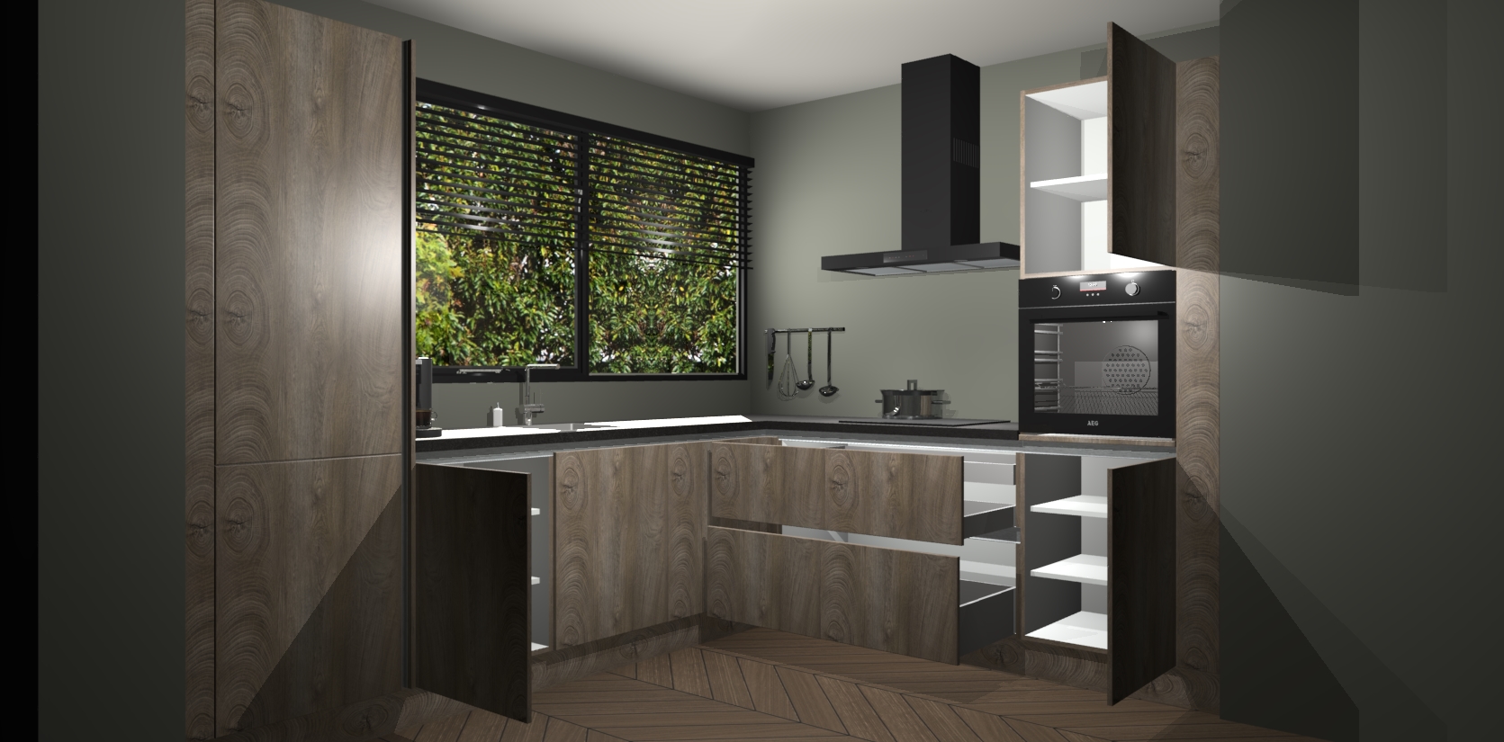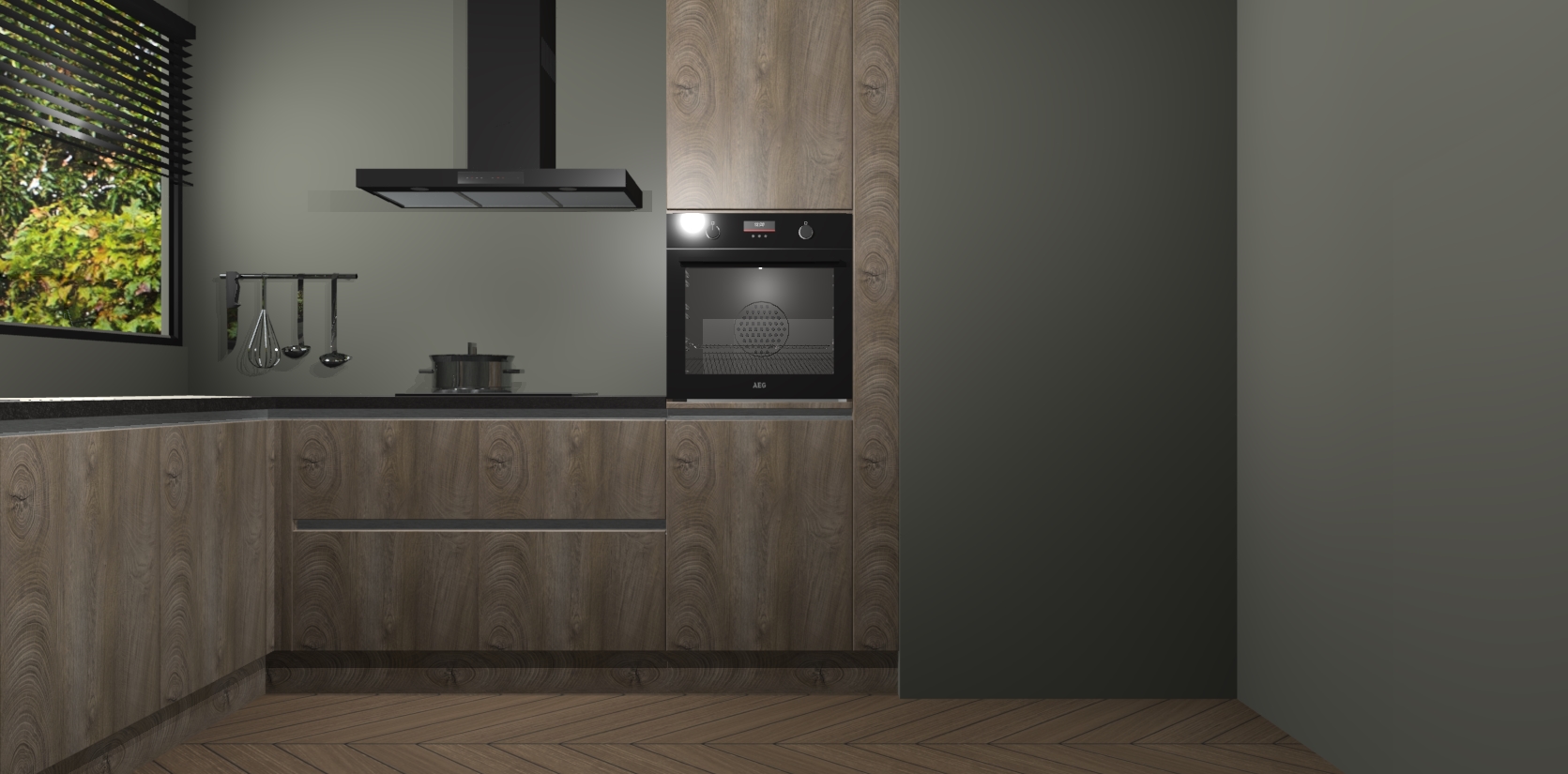 Met een modern, tijdloos design en ruime opslagruimte, zult u zich in no-time thuis voelen in uw nieuwe keuken. Uw leven wordt eenvoudiger met de soft-close deuren die voor het ultieme stille comfort zorgen - geen geluid dat u stoort terwijl u kookt. Ook is de keuken voorzien van 5 ingebouwde apparaten: een oven, inductie kookplaat, afzuigkap, vaatwasser en koelkast. Deze kunnen gemakkelijk na bestelling worden bijgewerkt naar AEG - waardoor uw luxe ervaring compleet is.