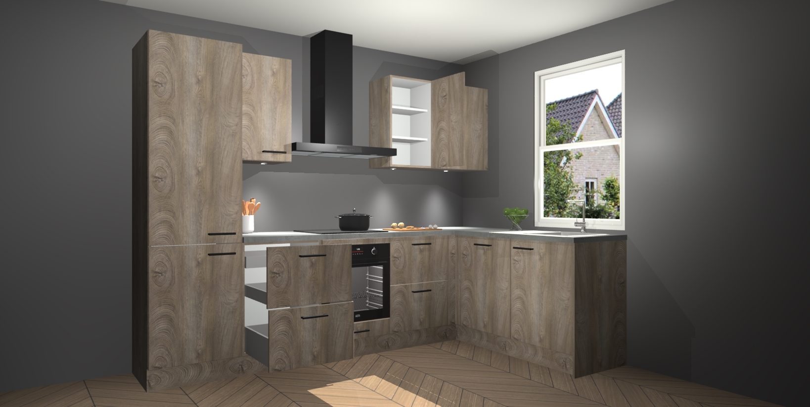 Maak kennis met de trendsettende en luxe Cantaro Eiken keuken Bazel! Deze uitzonderlijke keuken van Duitse kwaliteit is stijlvol, modern en perfect om elk huis mee op te fleuren. De binnenkant van de kasten worden meegenomen in een bijpassende kleur om een samenhangende eigentijdse esthetiek te voltooien. U zult dol zijn op hoe uw pas gerenoveerde keuken eruitziet met de Cantaro Eiken editie!