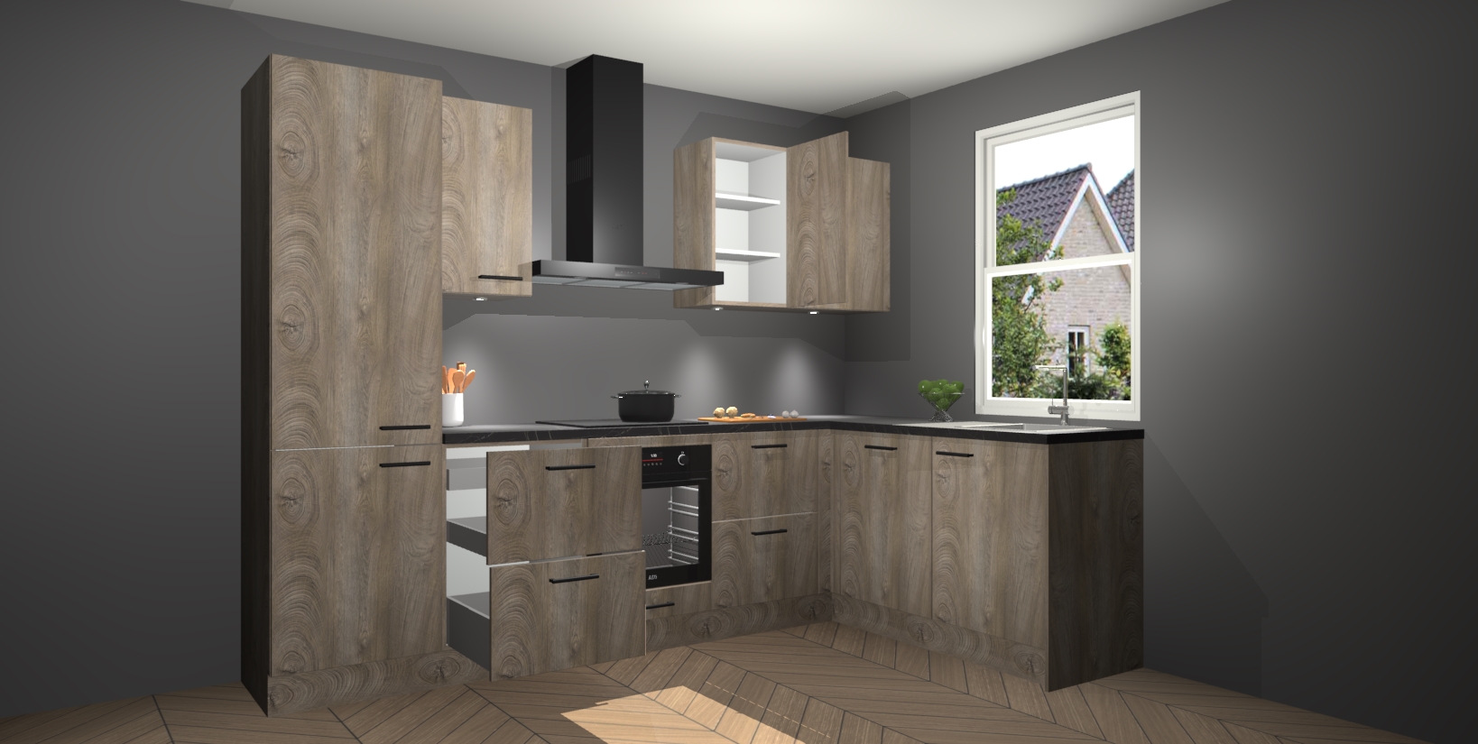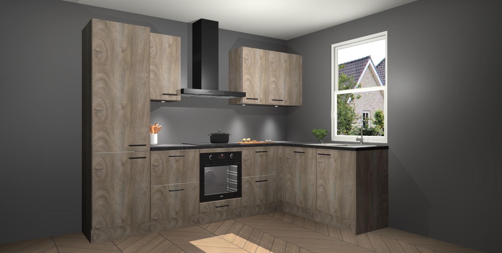 Maak kennis met de trendsettende en luxe Cantaro Eiken keuken Bazel! Deze uitzonderlijke keuken van Duitse kwaliteit is stijlvol, modern en perfect om elk huis mee op te fleuren. De binnenkant van de kasten worden meegenomen in een bijpassende kleur om een samenhangende eigentijdse esthetiek te voltooien. U zult dol zijn op hoe uw pas gerenoveerde keuken eruitziet met de Cantaro Eiken editie!