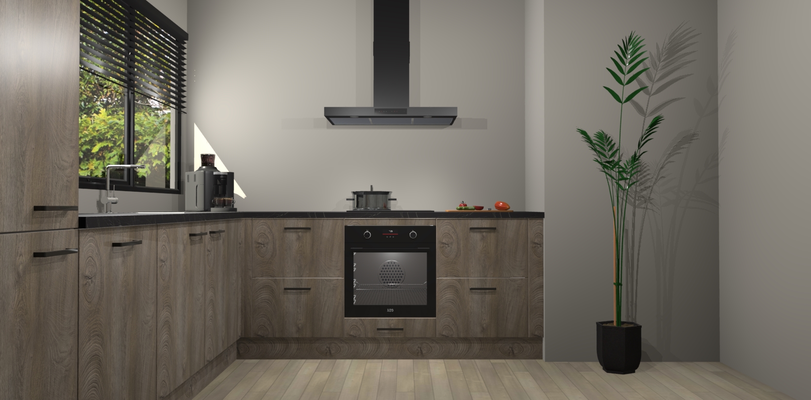 Met een modern, tijdloos design en ruime opslagruimte, zult u zich in no-time thuis voelen in uw nieuwe keuken. Uw leven wordt eenvoudiger met de soft-close deuren die voor het ultieme stille comfort zorgen - geen geluid dat u stoort terwijl u kookt. Ook is de keuken voorzien van 5 ingebouwde apparaten: een oven, inductie kookplaat, afzuigkap, vaatwasser en koelkast. Deze kunnen gemakkelijk na bestelling worden bijgewerkt naar AEG - waardoor uw luxe ervaring compleet is.