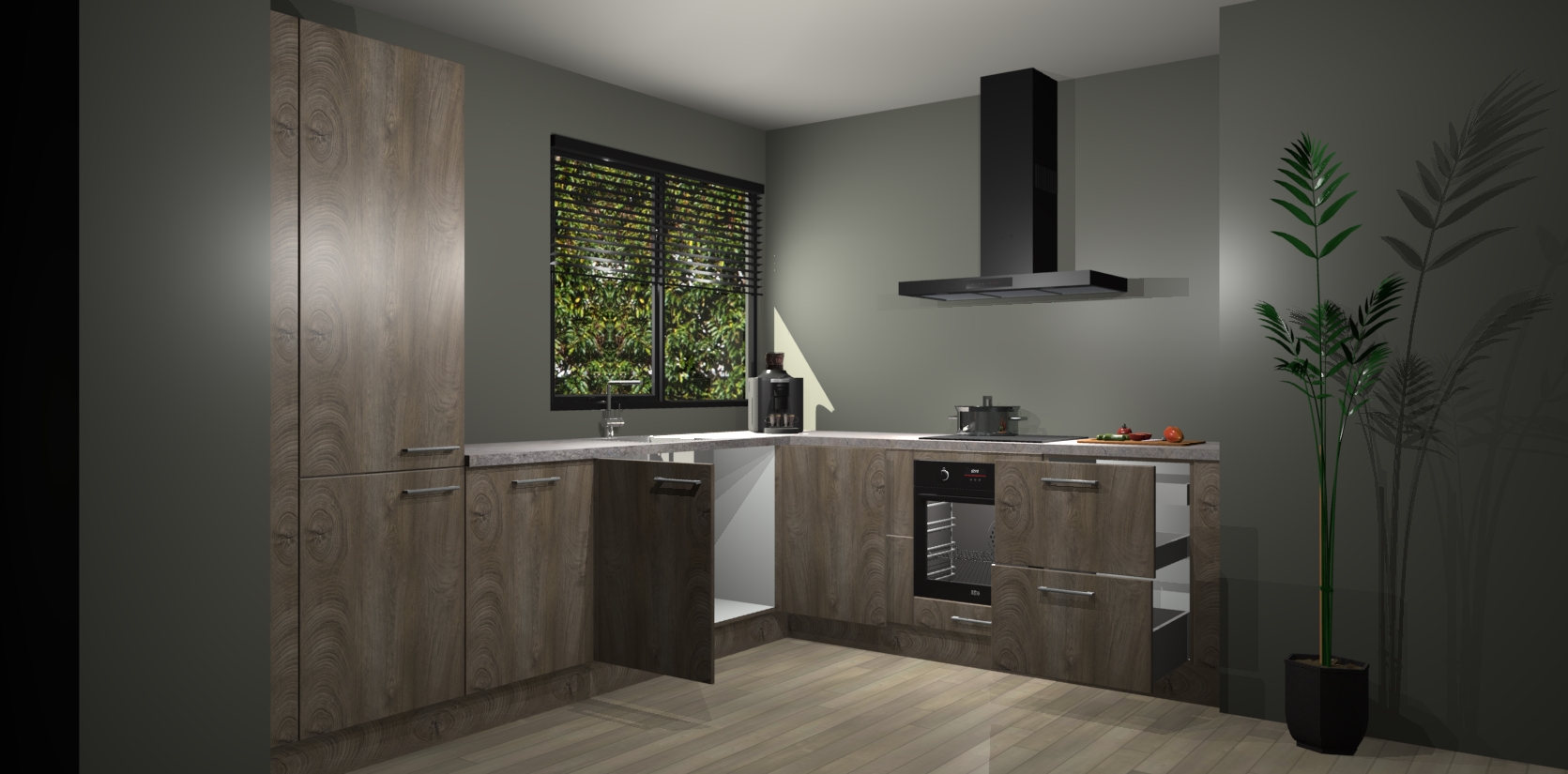 Met een modern, tijdloos design en ruime opslagruimte, zult u zich in no-time thuis voelen in uw nieuwe keuken. Uw leven wordt eenvoudiger met de soft-close deuren die voor het ultieme stille comfort zorgen - geen geluid dat u stoort terwijl u kookt. Ook is de keuken voorzien van 5 ingebouwde apparaten: een oven, inductie kookplaat, afzuigkap, vaatwasser en koelkast. Deze kunnen gemakkelijk na bestelling worden bijgewerkt naar AEG - waardoor uw luxe ervaring compleet is.