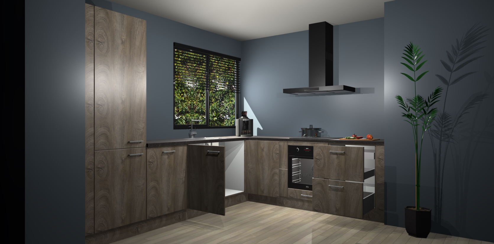 Met een modern, tijdloos design en ruime opslagruimte, zult u zich in no-time thuis voelen in uw nieuwe keuken. Uw leven wordt eenvoudiger met de soft-close deuren die voor het ultieme stille comfort zorgen - geen geluid dat u stoort terwijl u kookt. Ook is de keuken voorzien van 5 ingebouwde apparaten: een oven, inductie kookplaat, afzuigkap, vaatwasser en koelkast. Deze kunnen gemakkelijk na bestelling worden bijgewerkt naar AEG - waardoor uw luxe ervaring compleet is.