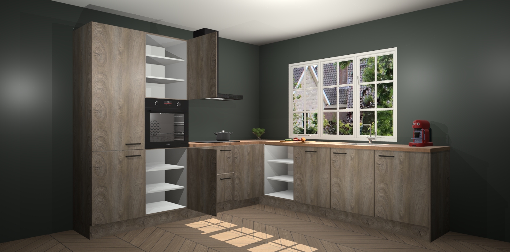 De keuken heeft veel opbergruimte, waardoor u alle ingrediënten gemakkelijk bereikbaar hebt staan. En daarnaast bevat deze volledig uitgeruste keuken ook 5 ingebouwde apparaten: een oven, inductiekookplaat, afzuigkap, vaatwasser en koelkast. Deze zijn heel eenvoudig na bestellen te upgraden naar AEG als u dit wilt. Bovendien zijn de softclose-kastdeuren ideaal; geef ze gewoon even een tikje en ze sluiten automatisch met geruisloze precisie.
