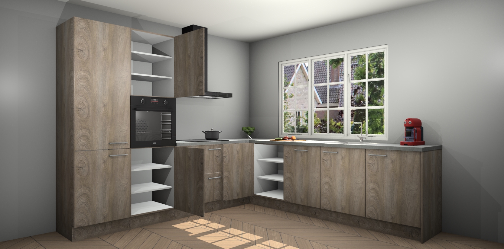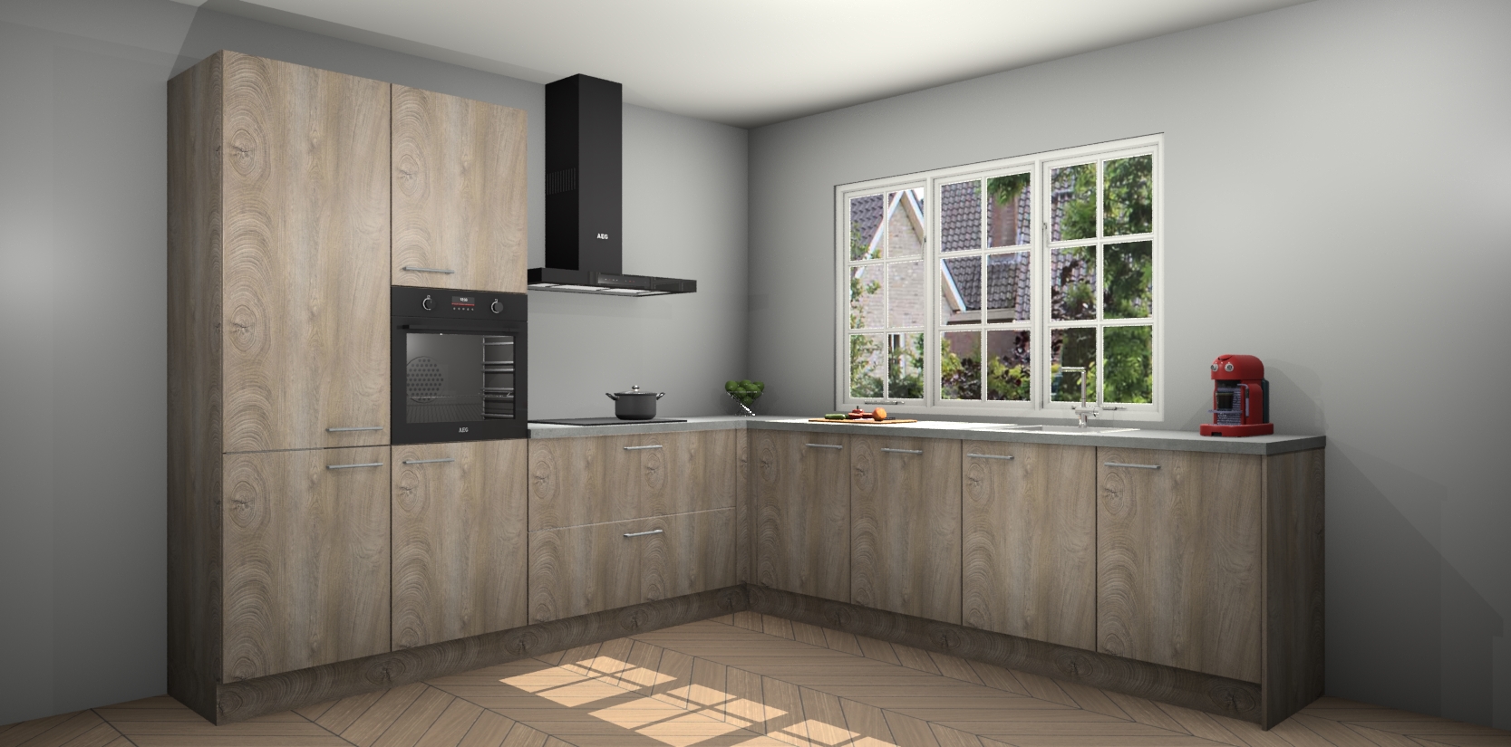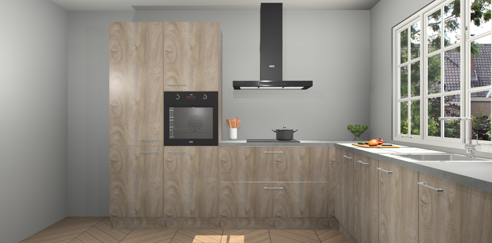 De keuken heeft veel opbergruimte, waardoor u alle ingrediënten gemakkelijk bereikbaar hebt staan. En daarnaast bevat deze volledig uitgeruste keuken ook 5 ingebouwde apparaten: een oven, inductiekookplaat, afzuigkap, vaatwasser en koelkast. Deze zijn heel eenvoudig na bestellen te upgraden naar AEG als u dit wilt. Bovendien zijn de softclose-kastdeuren ideaal; geef ze gewoon even een tikje en ze sluiten automatisch met geruisloze precisie.