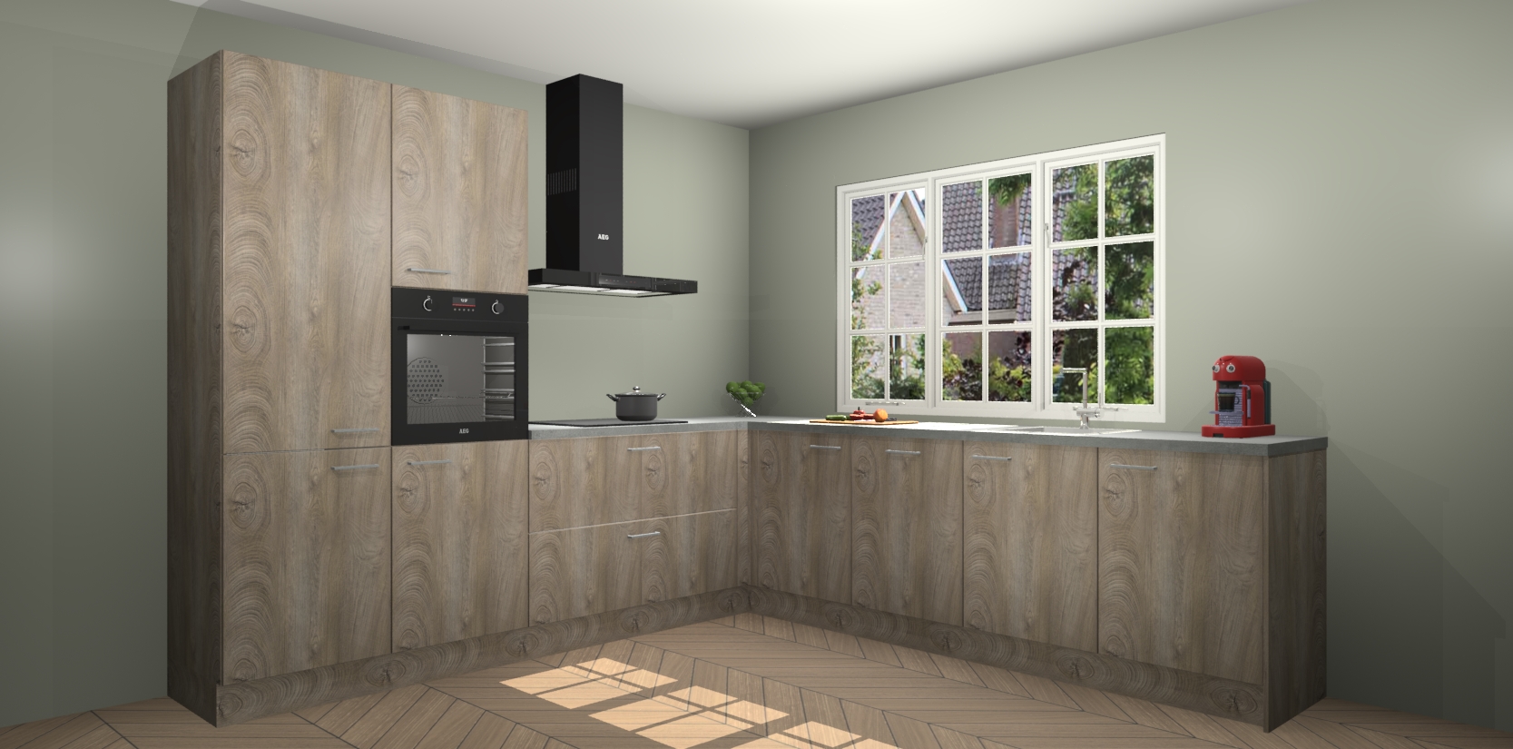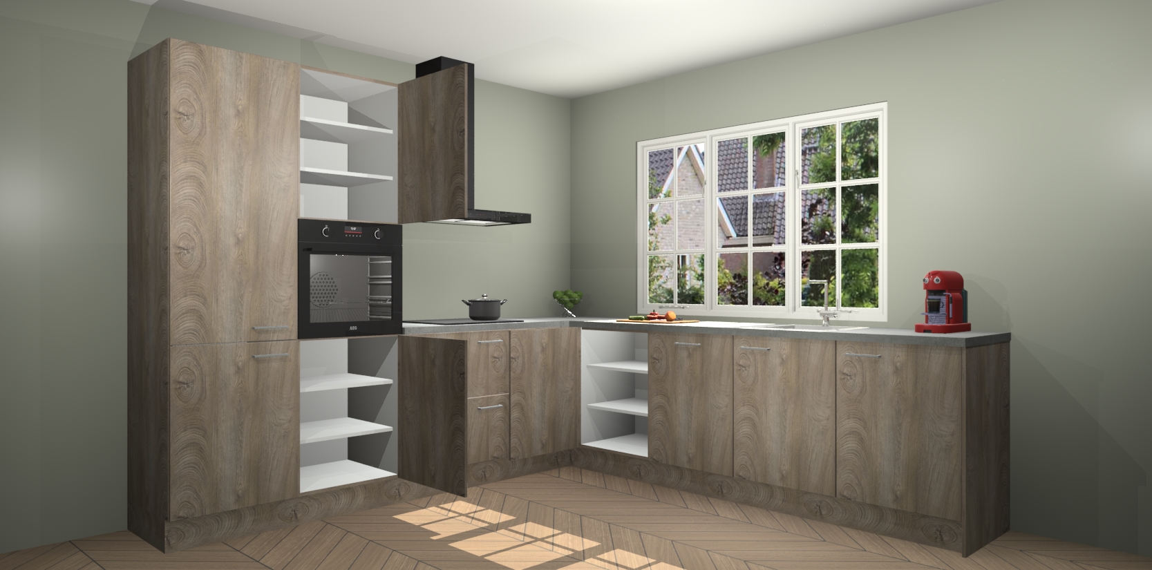 De keuken heeft veel opbergruimte, waardoor u alle ingrediënten gemakkelijk bereikbaar hebt staan. En daarnaast bevat deze volledig uitgeruste keuken ook 5 ingebouwde apparaten: een oven, inductiekookplaat, afzuigkap, vaatwasser en koelkast. Deze zijn heel eenvoudig na bestellen te upgraden naar AEG als u dit wilt. Bovendien zijn de softclose-kastdeuren ideaal; geef ze gewoon even een tikje en ze sluiten automatisch met geruisloze precisie.