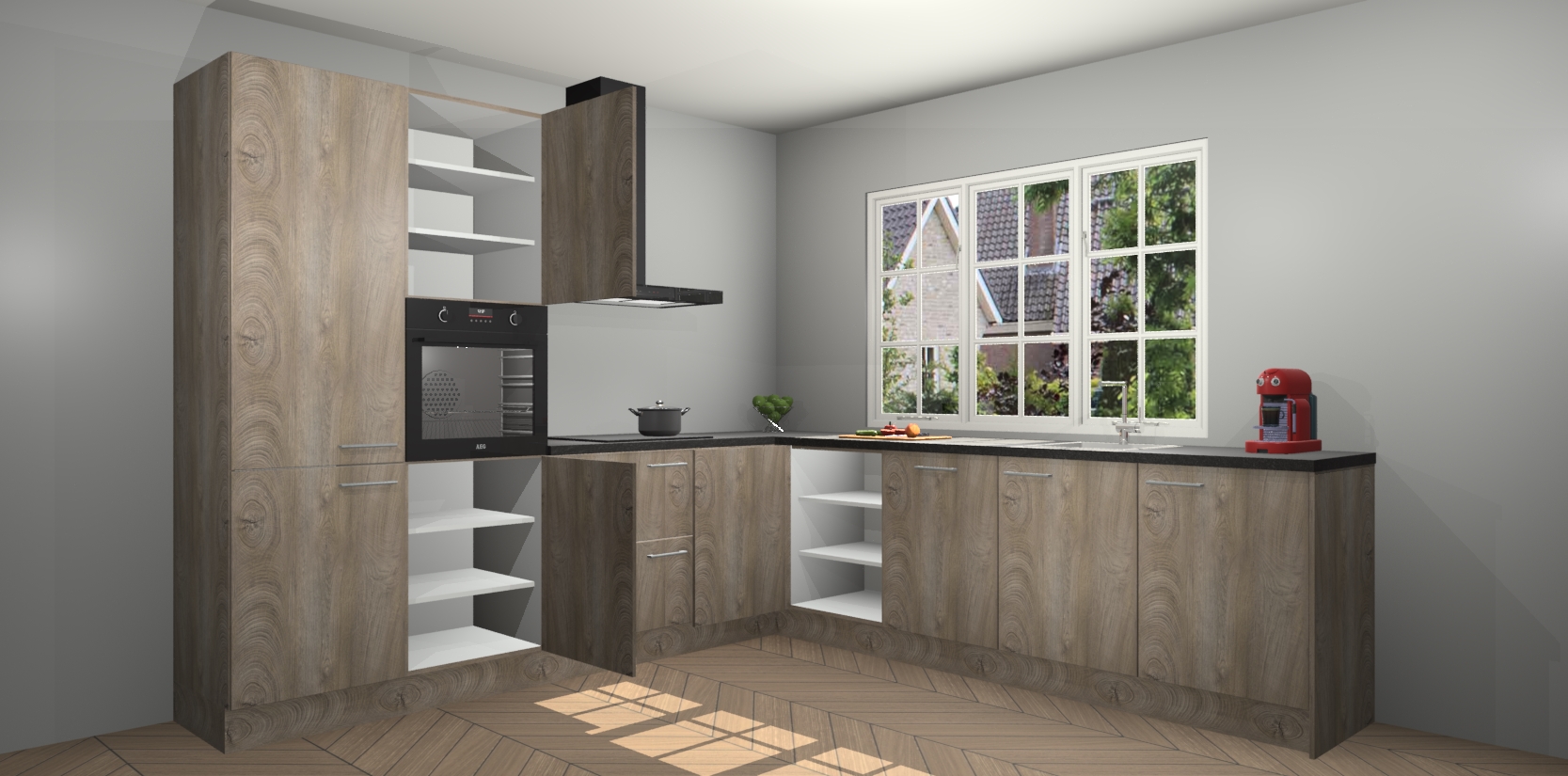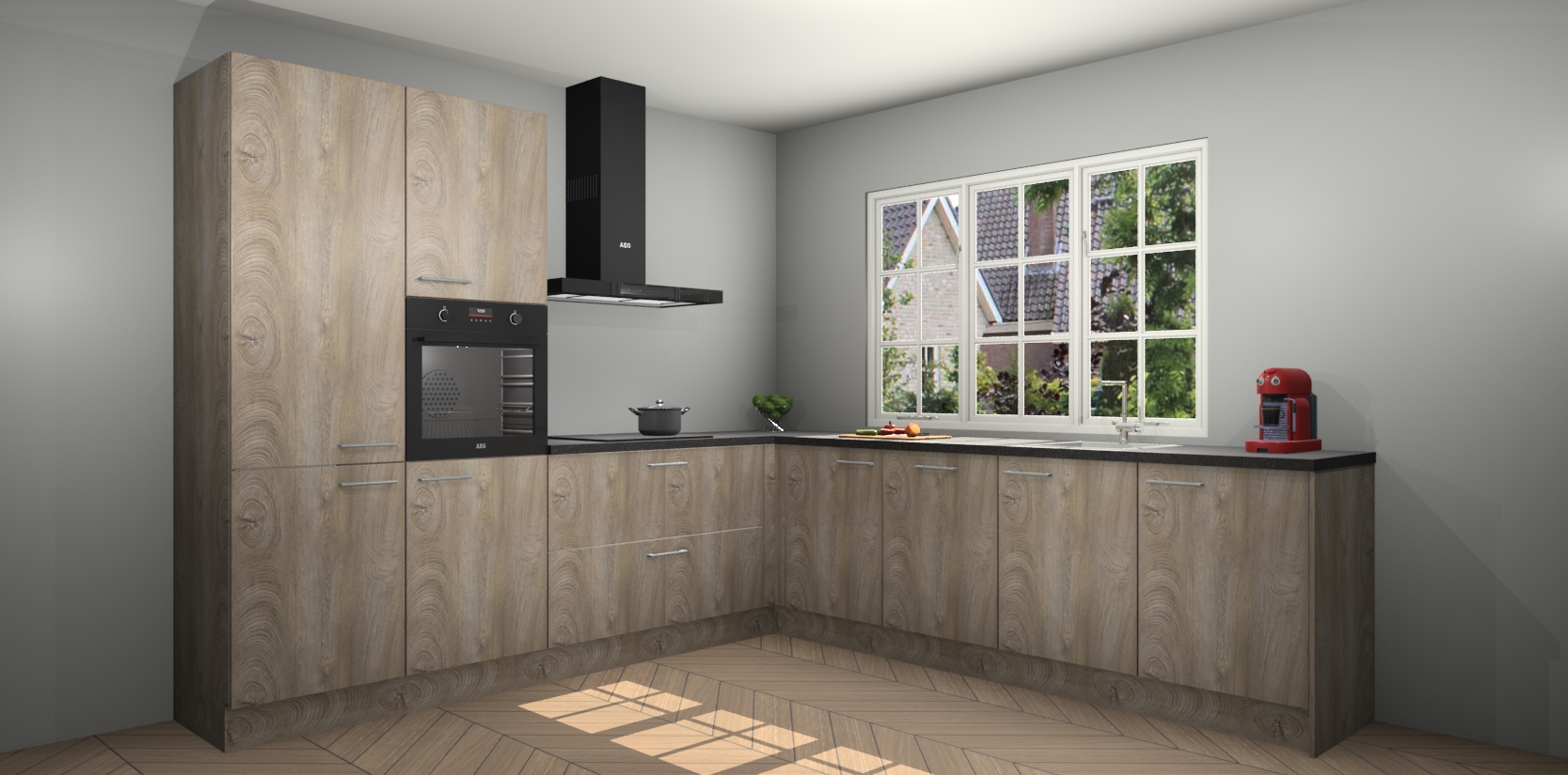 De keuken heeft veel opbergruimte, waardoor u alle ingrediënten gemakkelijk bereikbaar hebt staan. En daarnaast bevat deze volledig uitgeruste keuken ook 5 ingebouwde apparaten: een oven, inductiekookplaat, afzuigkap, vaatwasser en koelkast. Deze zijn heel eenvoudig na bestellen te upgraden naar AEG als u dit wilt. Bovendien zijn de softclose-kastdeuren ideaal; geef ze gewoon even een tikje en ze sluiten automatisch met geruisloze precisie.