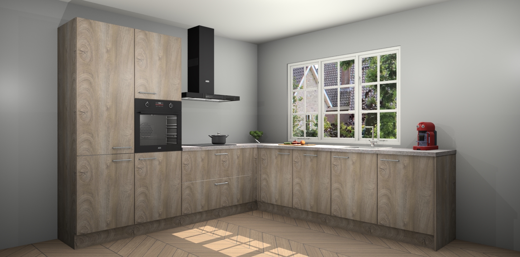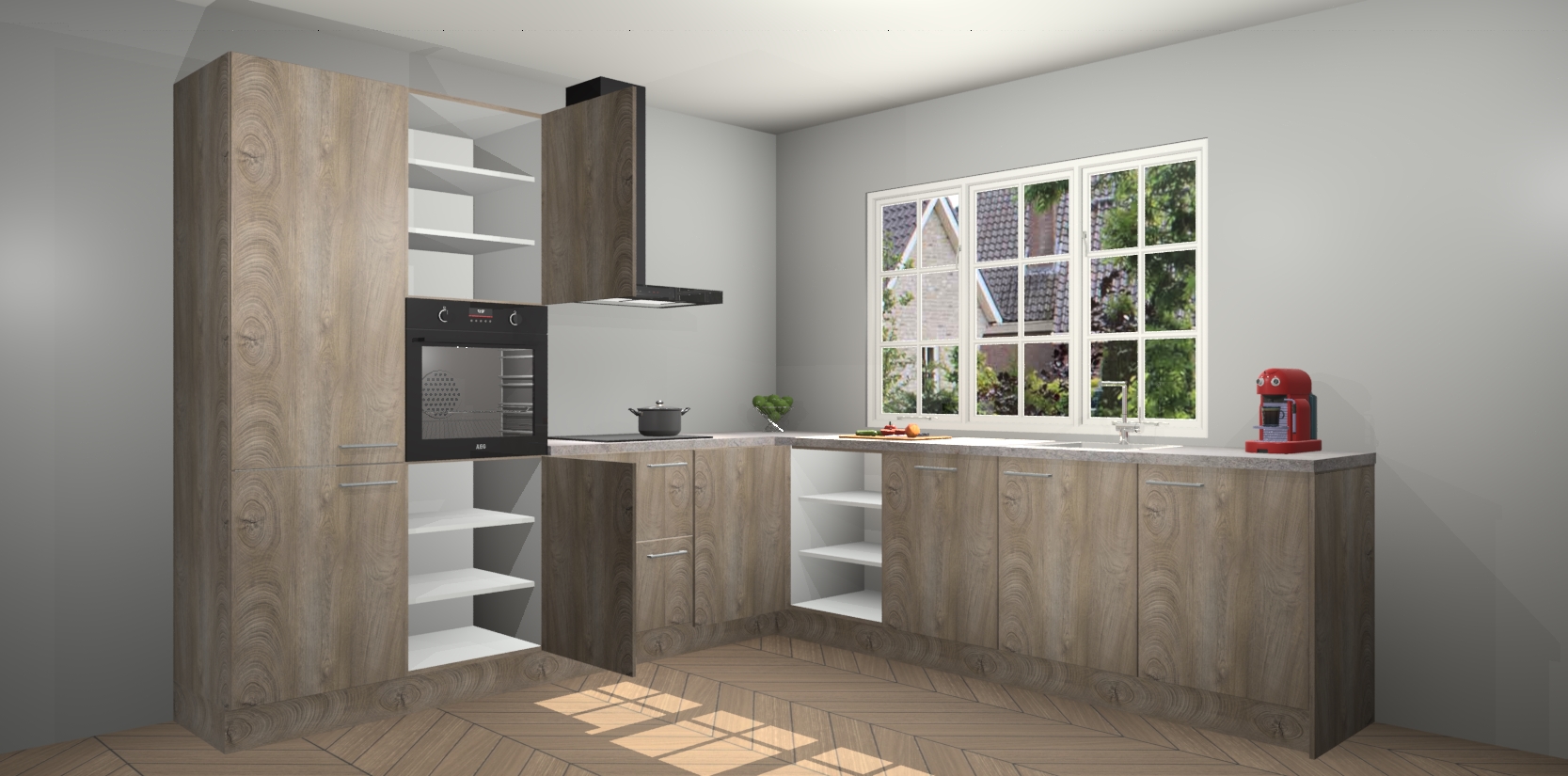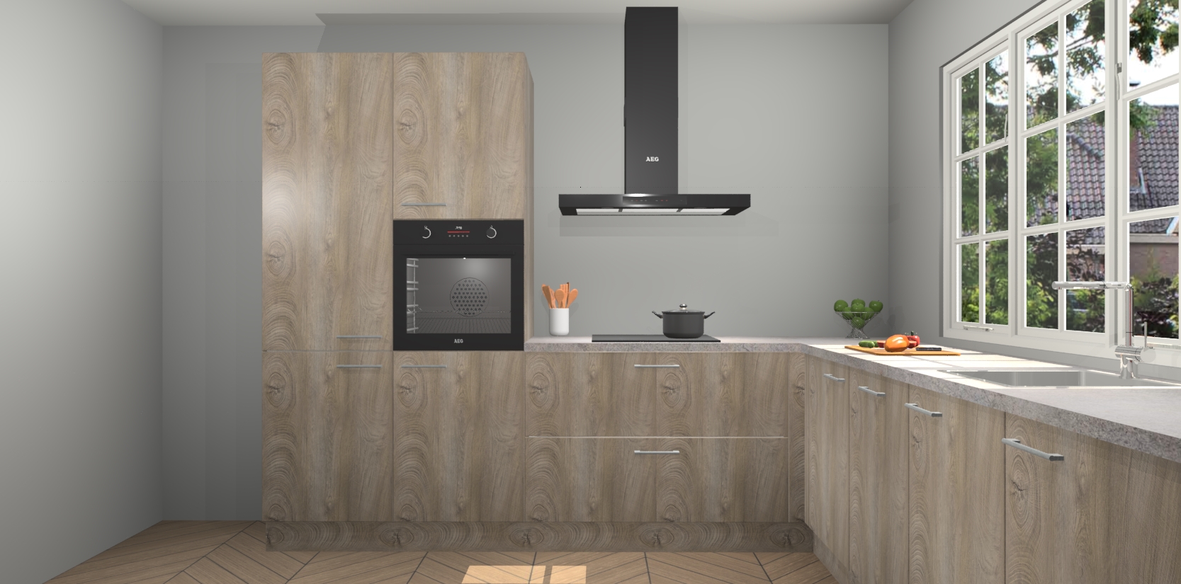 De keuken heeft veel opbergruimte, waardoor u alle ingrediënten gemakkelijk bereikbaar hebt staan. En daarnaast bevat deze volledig uitgeruste keuken ook 5 ingebouwde apparaten: een oven, inductiekookplaat, afzuigkap, vaatwasser en koelkast. Deze zijn heel eenvoudig na bestellen te upgraden naar AEG als u dit wilt. Bovendien zijn de softclose-kastdeuren ideaal; geef ze gewoon even een tikje en ze sluiten automatisch met geruisloze precisie.