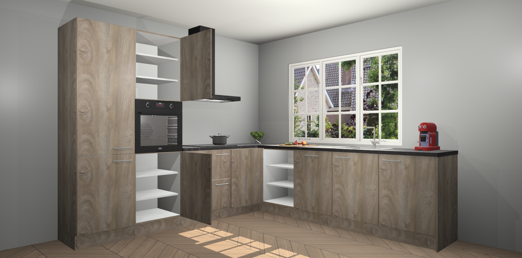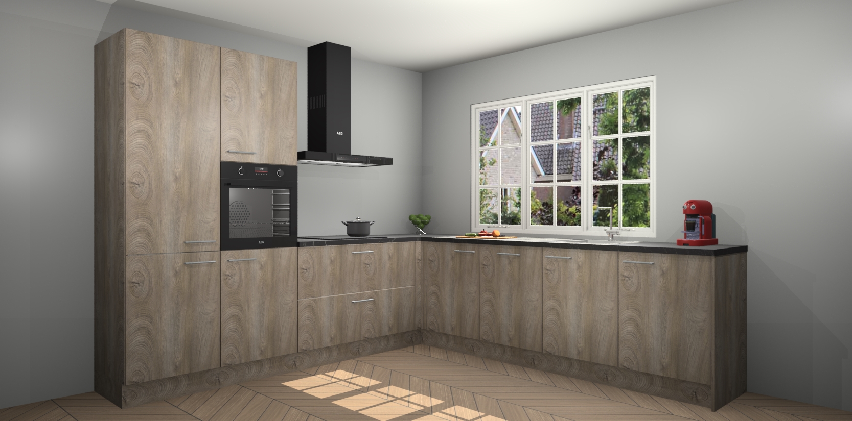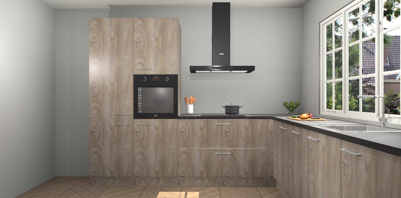 De keuken heeft veel opbergruimte, waardoor u alle ingrediënten gemakkelijk bereikbaar hebt staan. En daarnaast bevat deze volledig uitgeruste keuken ook 5 ingebouwde apparaten: een oven, inductiekookplaat, afzuigkap, vaatwasser en koelkast. Deze zijn heel eenvoudig na bestellen te upgraden naar AEG als u dit wilt. Bovendien zijn de softclose-kastdeuren ideaal; geef ze gewoon even een tikje en ze sluiten automatisch met geruisloze precisie.