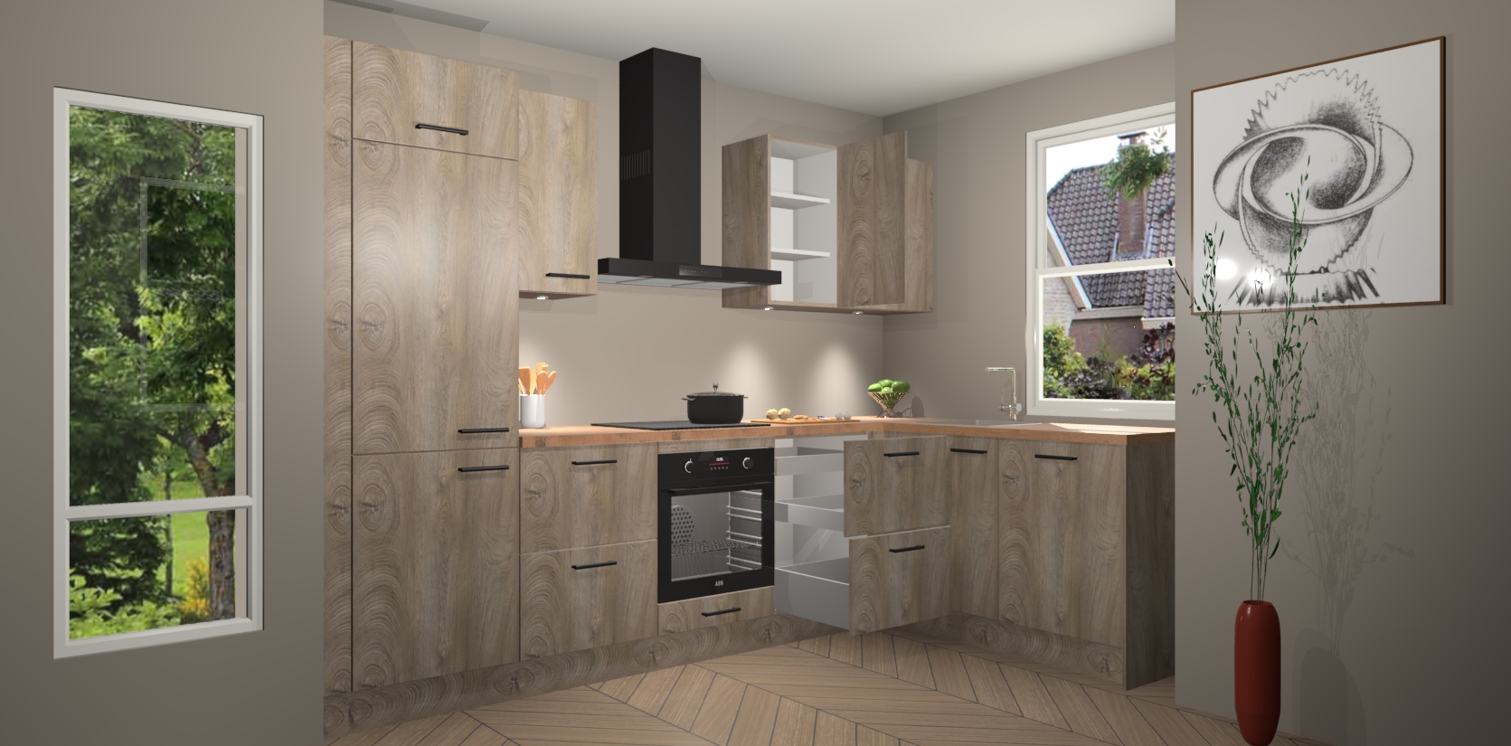 Bent u op zoek naar een moderne en tijdloze keuken die schoonheid in uw huis brengt? Zoek dan niet verder dan de Cantaro Eiken keuken Geneve - de perfecte keuken voor al uw wensen. Deze hoekkeuken biedt de hoogste Duitse kwaliteit voor een vaste lage prijs en is zeker een blikvanger in uw huis!