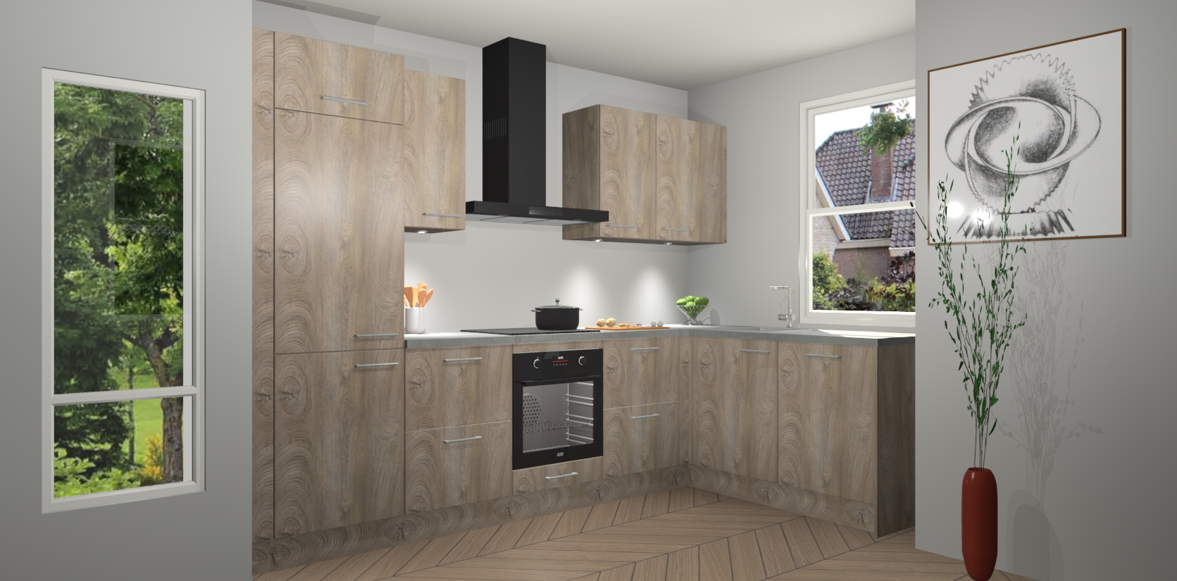 Bent u op zoek naar een moderne en tijdloze keuken die schoonheid in uw huis brengt? Zoek dan niet verder dan de Cantaro Eiken keuken Geneve - de perfecte keuken voor al uw wensen. Deze hoekkeuken biedt de hoogste Duitse kwaliteit voor een vaste lage prijs en is zeker een blikvanger in uw huis!
