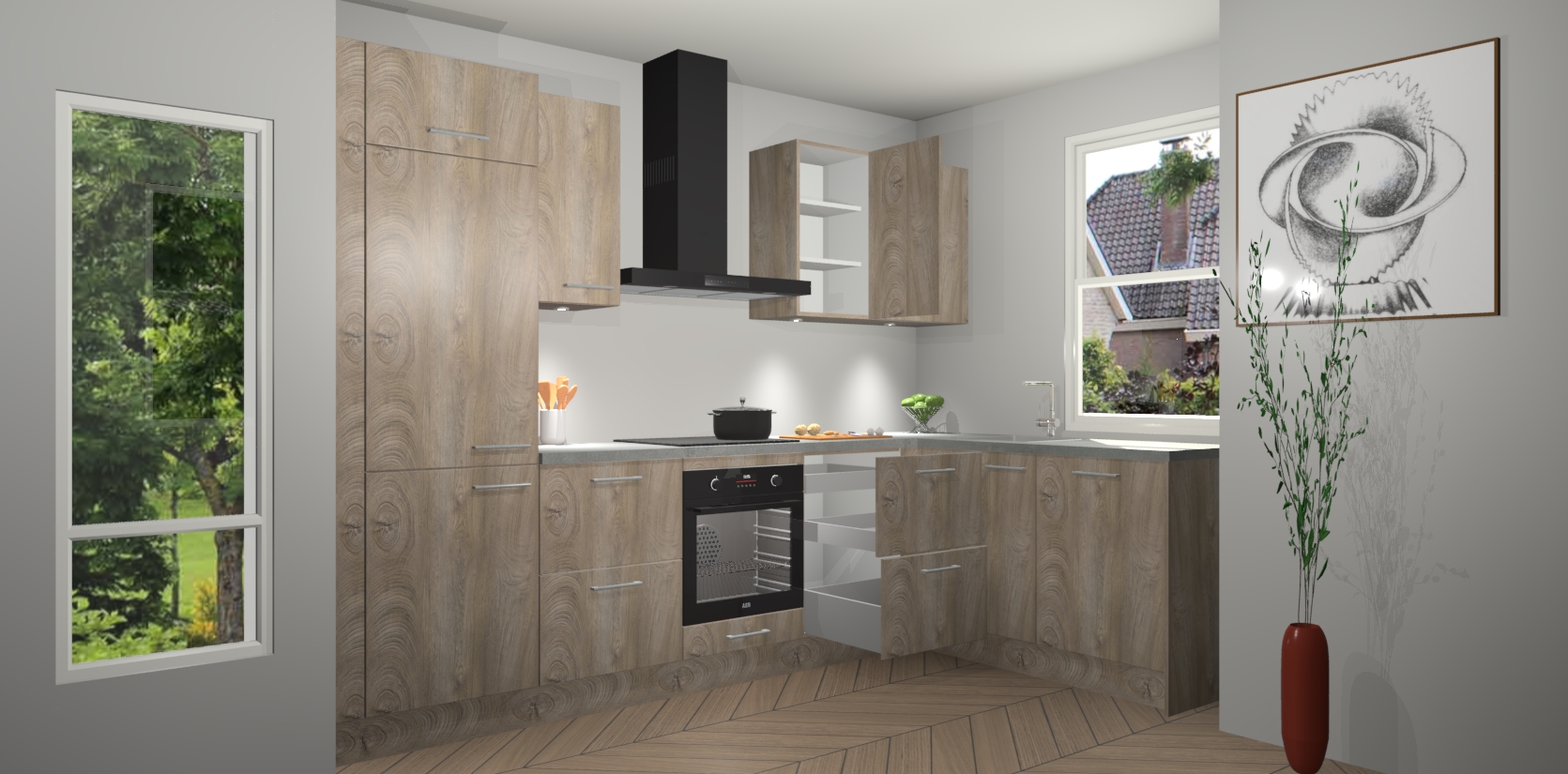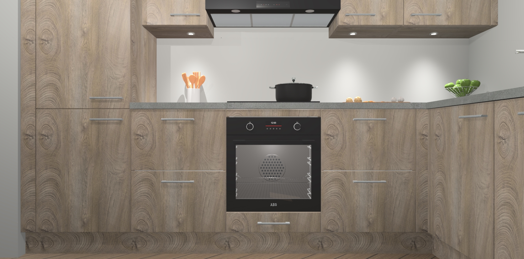 De Cantaro Eiken keuken Geneve is uitgerust met 5 inbouwapparaten - een oven, inductiekookplaat, afzuigkap, vaatwasser en koelkast - voor al uw kook- en bewaarbehoeftes. U kunt deze apparaten desgewenst eenvoudig upgraden naar AEG of de oven omruilen voor een combimagnetron na het plaatsen van uw bestelling. En met de soft close deuren, voldoende opbergruimte en kasten die voorgemonteerd worden geleverd, bent u in een mum van tijd klaar om heerlijke maaltijden te bereiden!