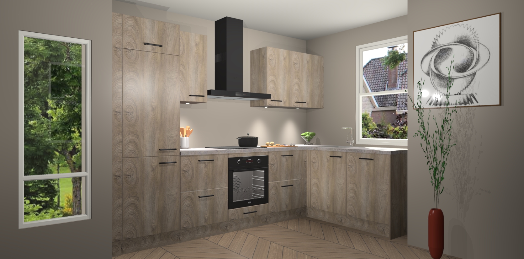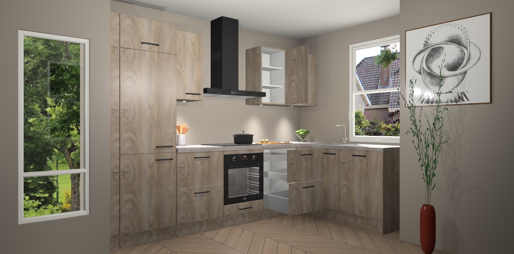 Bent u op zoek naar een moderne en tijdloze keuken die schoonheid in uw huis brengt? Zoek dan niet verder dan de Cantaro Eiken keuken Geneve - de perfecte keuken voor al uw wensen. Deze hoekkeuken biedt de hoogste Duitse kwaliteit voor een vaste lage prijs en is zeker een blikvanger in uw huis!