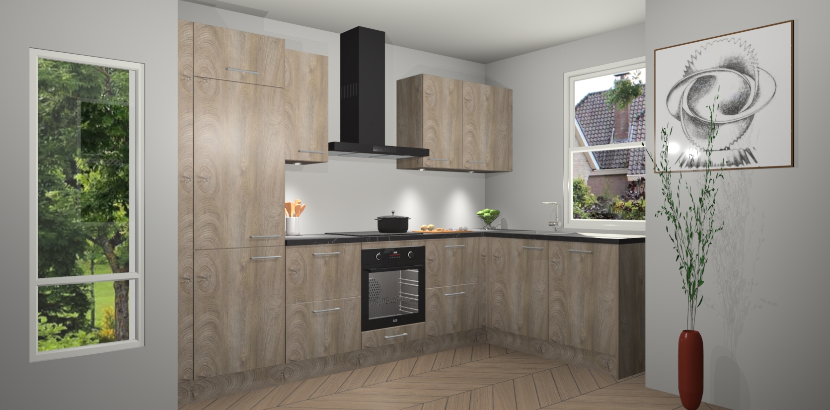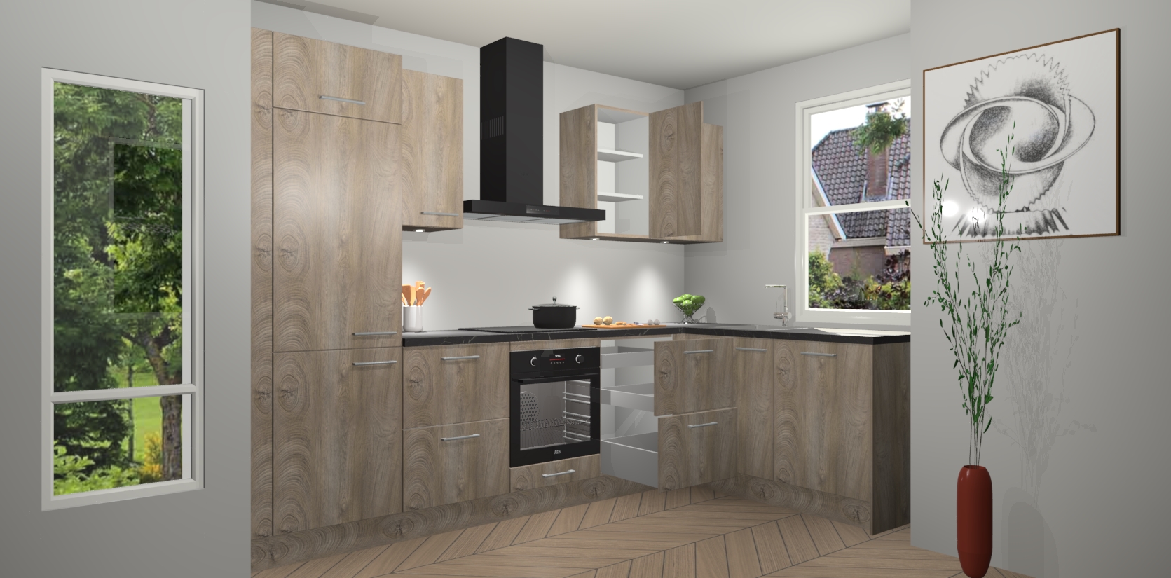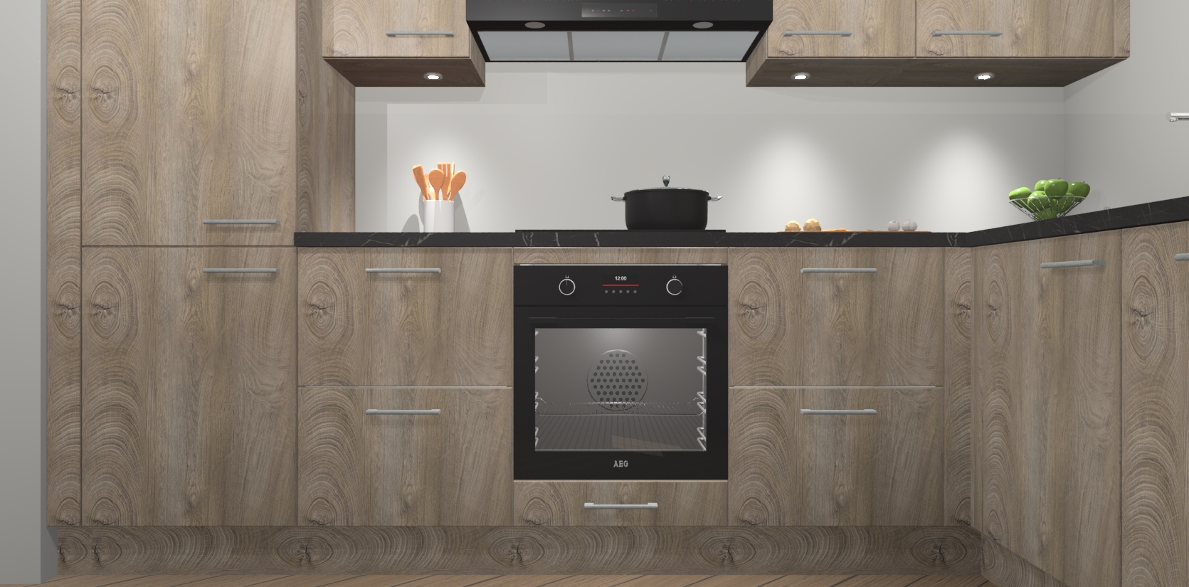 De Cantaro Eiken keuken Geneve is uitgerust met 5 inbouwapparaten - een oven, inductiekookplaat, afzuigkap, vaatwasser en koelkast - voor al uw kook- en bewaarbehoeftes. U kunt deze apparaten desgewenst eenvoudig upgraden naar AEG of de oven omruilen voor een combimagnetron na het plaatsen van uw bestelling. En met de soft close deuren, voldoende opbergruimte en kasten die voorgemonteerd worden geleverd, bent u in een mum van tijd klaar om heerlijke maaltijden te bereiden!