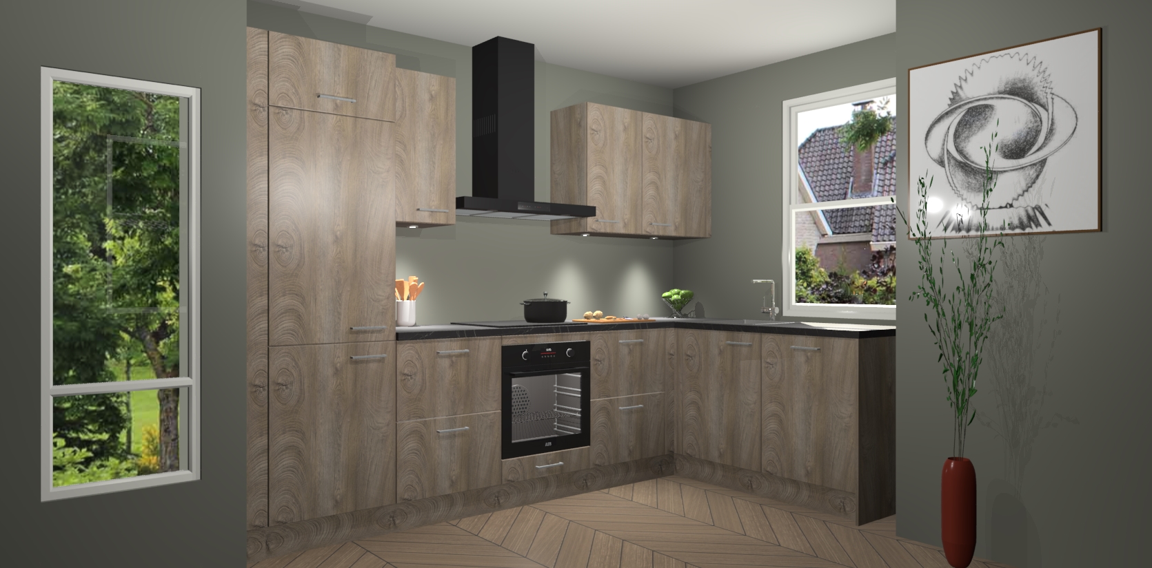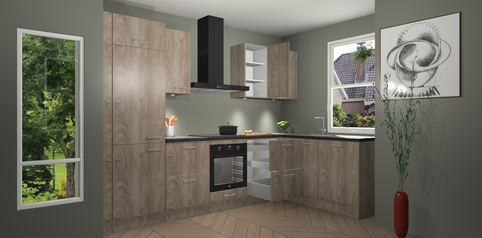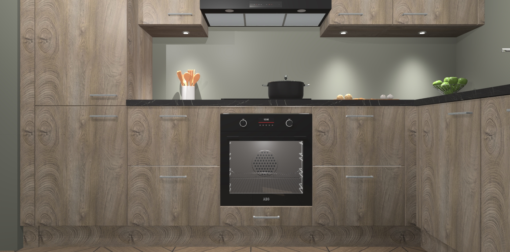 De Cantaro Eiken keuken Geneve is uitgerust met 5 inbouwapparaten - een oven, inductiekookplaat, afzuigkap, vaatwasser en koelkast - voor al uw kook- en bewaarbehoeftes. U kunt deze apparaten desgewenst eenvoudig upgraden naar AEG of de oven omruilen voor een combimagnetron na het plaatsen van uw bestelling. En met de soft close deuren, voldoende opbergruimte en kasten die voorgemonteerd worden geleverd, bent u in een mum van tijd klaar om heerlijke maaltijden te bereiden!