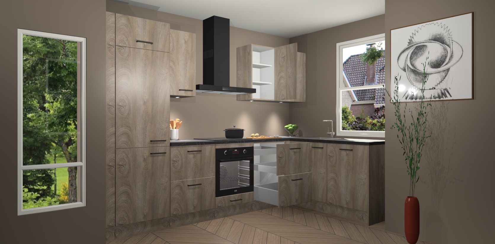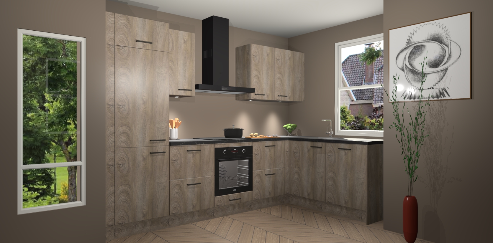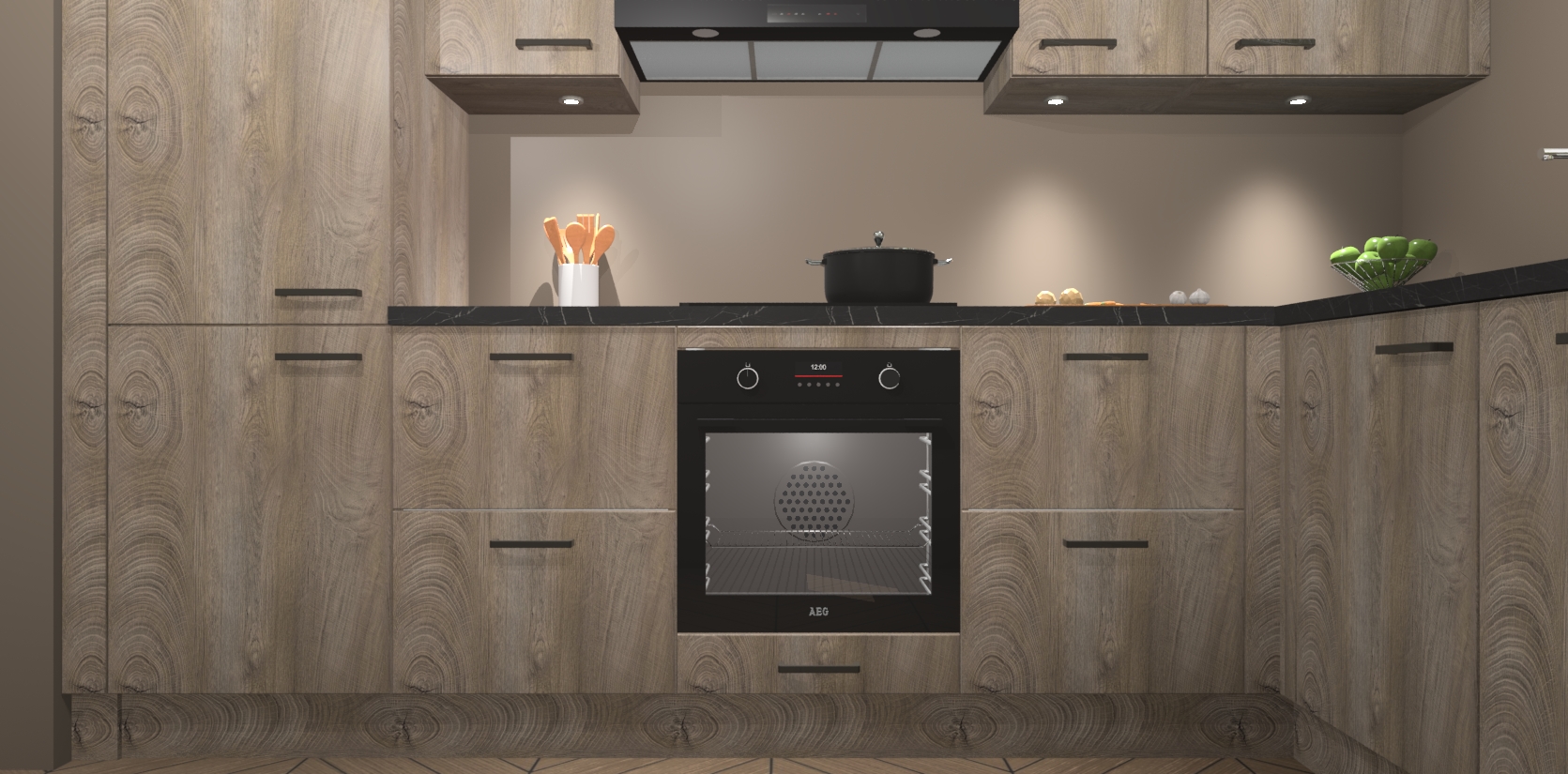 De Cantaro Eiken keuken Geneve is uitgerust met 5 inbouwapparaten - een oven, inductiekookplaat, afzuigkap, vaatwasser en koelkast - voor al uw kook- en bewaarbehoeftes. U kunt deze apparaten desgewenst eenvoudig upgraden naar AEG of de oven omruilen voor een combimagnetron na het plaatsen van uw bestelling. En met de soft close deuren, voldoende opbergruimte en kasten die voorgemonteerd worden geleverd, bent u in een mum van tijd klaar om heerlijke maaltijden te bereiden!