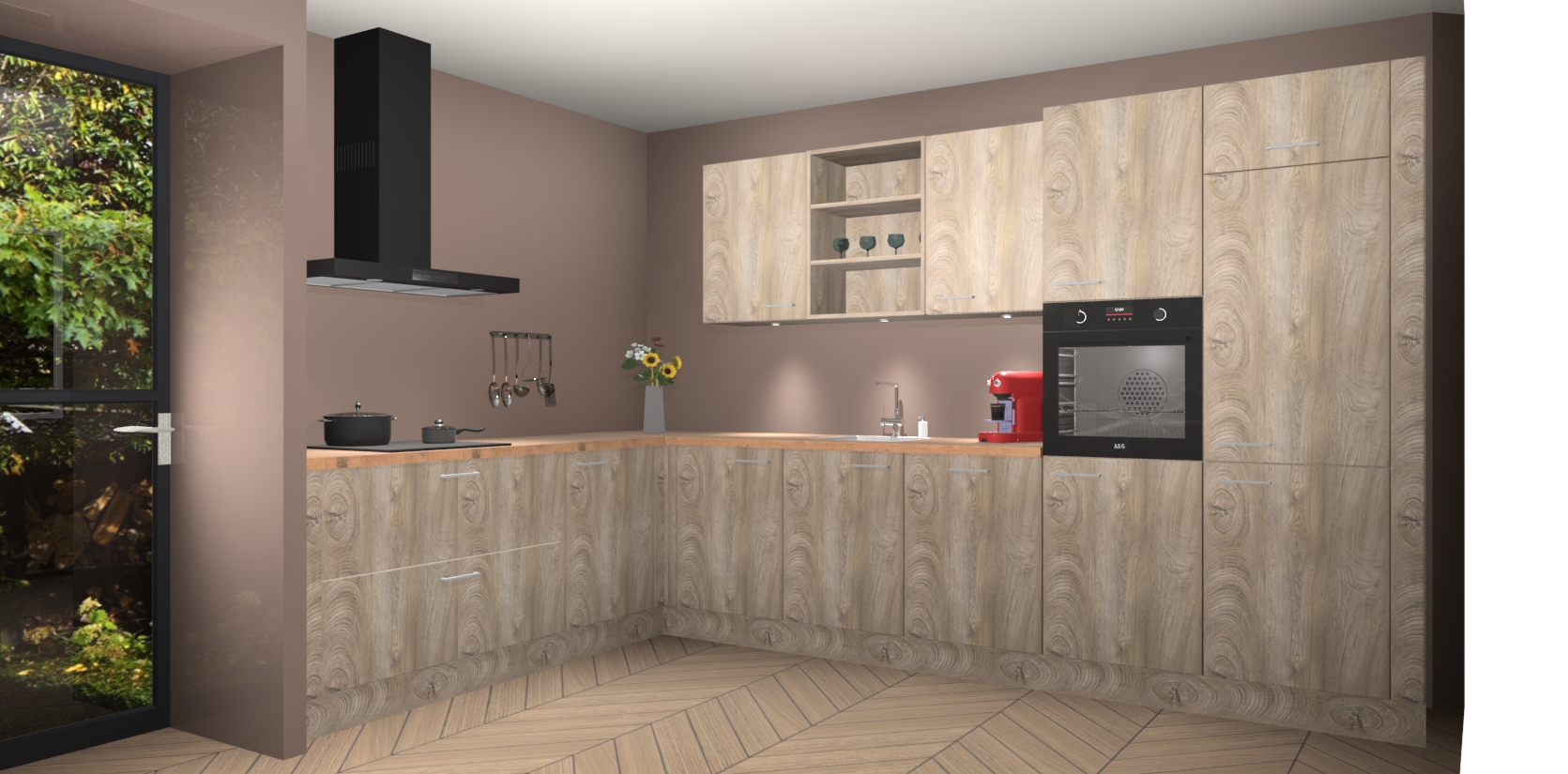 De Cantaro Eiken keuken Gotenburg is zo ontworpen dat u alle mogelijke vormen van opslagruimte kunt genieten. Bovendien heeft u meteen toegang tot vijf ingebouwde apparaten: een oven, inductiekookplaat, afzuigkap, vaatwasser en koelkast. Gewoon upgraden naar AEG na bestelling? Dit kan heel gemakkelijk worden geregeld. De deuren sluiten zacht dankzij zachtsluitende scharnieren en ze houden warmte vast terwijl ze uitzonderlijk stil blijven wanneer ze worden geopend of gesloten.