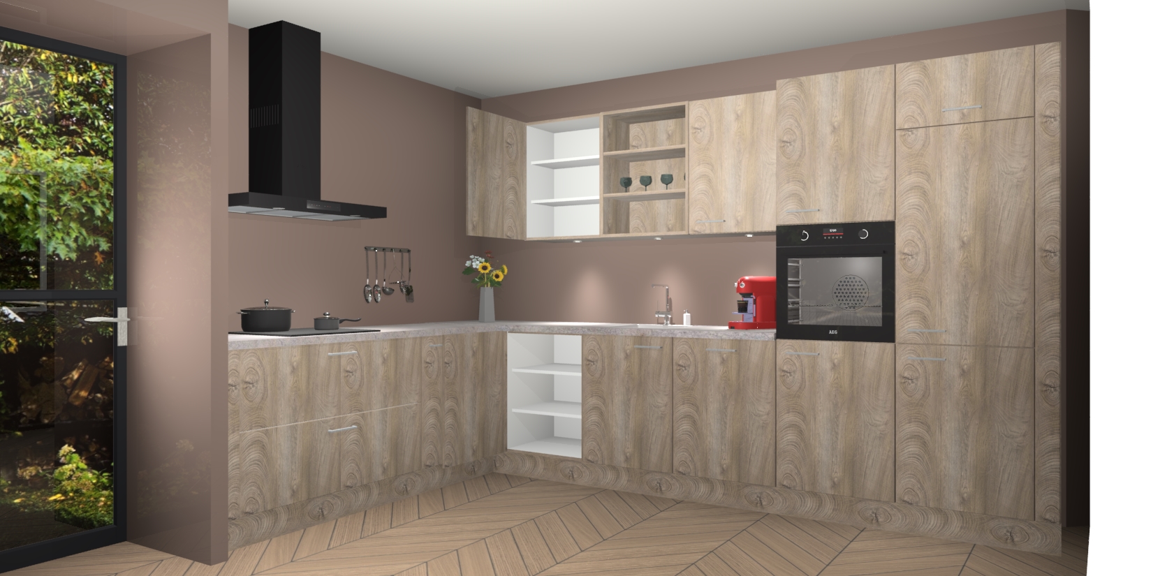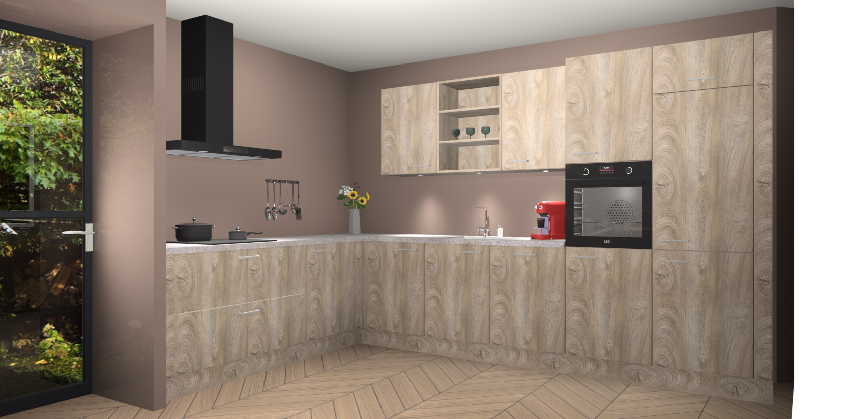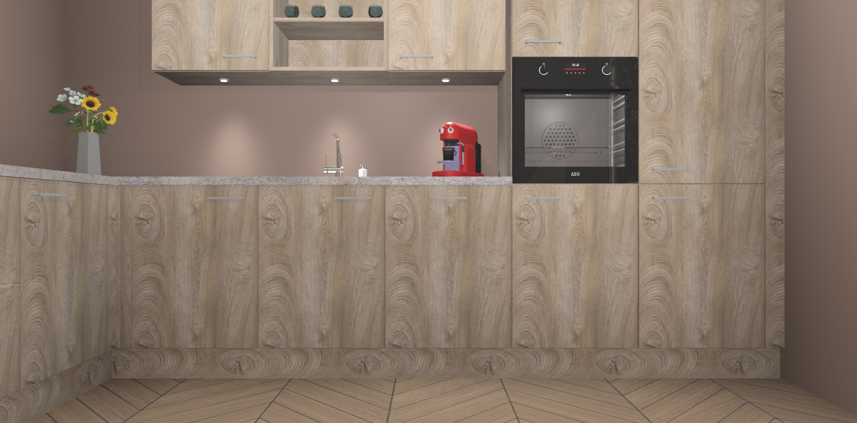 De Cantaro Eiken keuken Gotenburg is zo ontworpen dat u alle mogelijke vormen van opslagruimte kunt genieten. Bovendien heeft u meteen toegang tot vijf ingebouwde apparaten: een oven, inductiekookplaat, afzuigkap, vaatwasser en koelkast. Gewoon upgraden naar AEG na bestelling? Dit kan heel gemakkelijk worden geregeld. De deuren sluiten zacht dankzij zachtsluitende scharnieren en ze houden warmte vast terwijl ze uitzonderlijk stil blijven wanneer ze worden geopend of gesloten.
