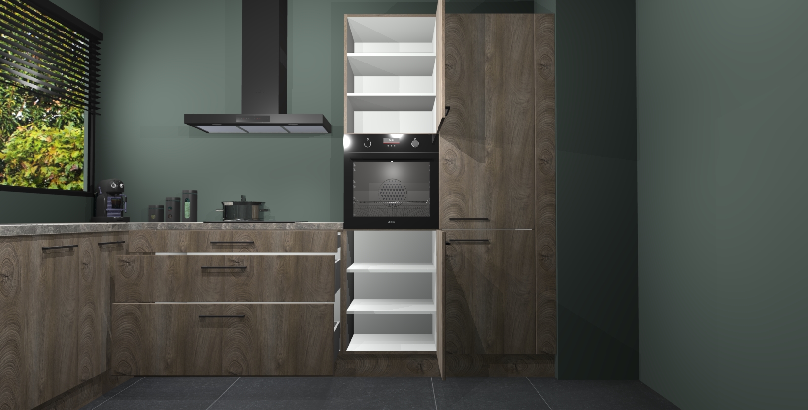 Met een modern, tijdloos design en ruime opslagruimte, zult u zich in no-time thuis voelen in uw nieuwe keuken. Uw leven wordt eenvoudiger met de soft-close deuren die voor het ultieme stille comfort zorgen - geen geluid dat u stoort terwijl u kookt. Ook is de keuken voorzien van 5 ingebouwde apparaten: een oven, inductie kookplaat, afzuigkap, vaatwasser en koelkast. Deze kunnen gemakkelijk na bestelling worden bijgewerkt naar AEG - waardoor uw luxe ervaring compleet is.