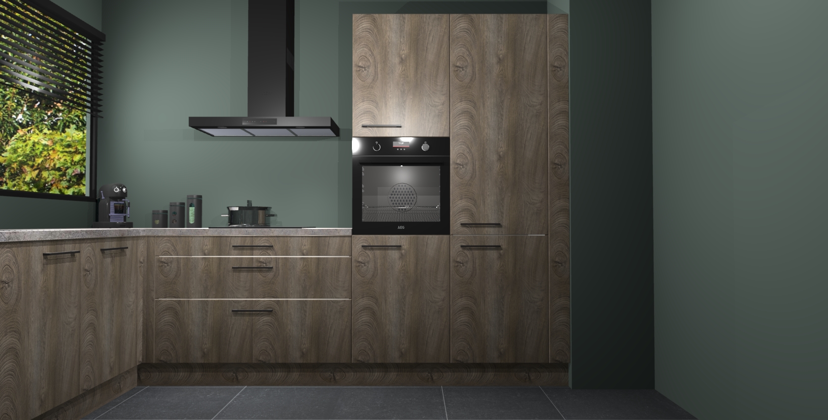Met een modern, tijdloos design en ruime opslagruimte, zult u zich in no-time thuis voelen in uw nieuwe keuken. Uw leven wordt eenvoudiger met de soft-close deuren die voor het ultieme stille comfort zorgen - geen geluid dat u stoort terwijl u kookt. Ook is de keuken voorzien van 5 ingebouwde apparaten: een oven, inductie kookplaat, afzuigkap, vaatwasser en koelkast. Deze kunnen gemakkelijk na bestelling worden bijgewerkt naar AEG - waardoor uw luxe ervaring compleet is.