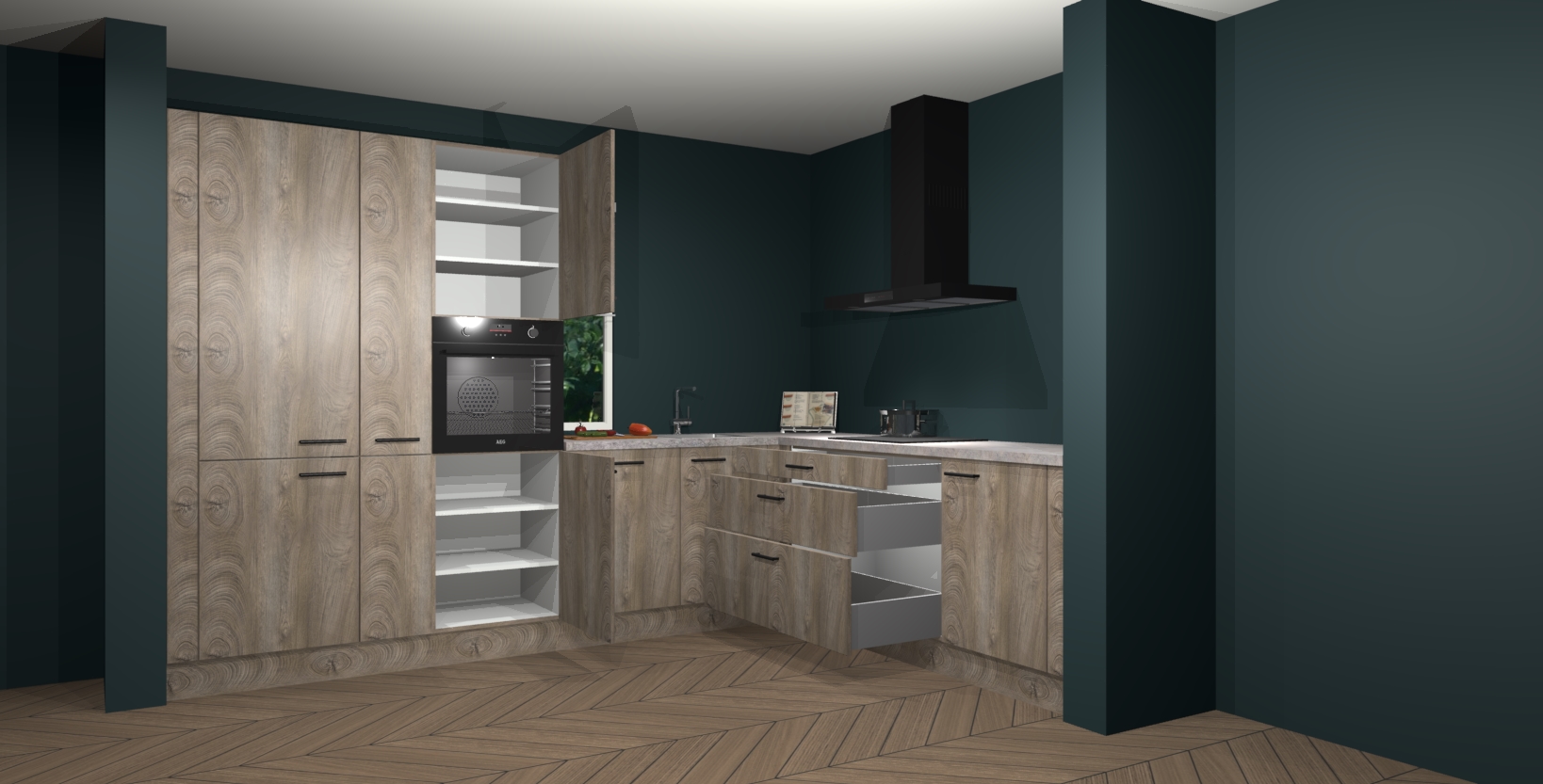 Met een modern, tijdloos design en ruime opslagruimte, zult u zich in no-time thuis voelen in uw nieuwe keuken. Uw leven wordt eenvoudiger met de soft-close deuren die voor het ultieme stille comfort zorgen - geen geluid dat u stoort terwijl u kookt. Ook is de keuken voorzien van 5 ingebouwde apparaten: een oven, inductie kookplaat, afzuigkap, vaatwasser en koelkast. Deze kunnen gemakkelijk na bestelling worden bijgewerkt naar AEG - waardoor uw luxe ervaring compleet is.
