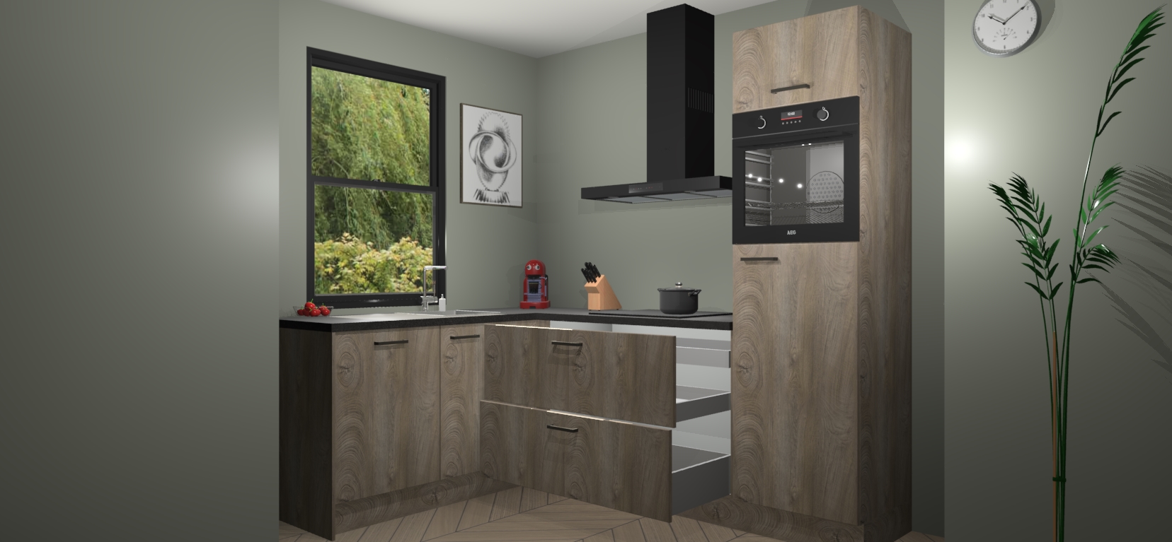 Deze prachtige hoekkeuken heeft alle benodigdheden om uw droomkook- en eetruimte compleet te maken. De Cantaro Eiken kasten bieden een echo van raffinement, terwijl de 5 inbouwapparaten genoeg opties bieden voor het bereiden van heerlijke maaltijden. De oven, inductiekookplaat, afzuigkap, vaatwasser en koelkast zorgen ervoor dat u tijd in de keuken zo efficiënt mogelijk verloopt, terwijl ze ook dat extra vleugje luxe bieden.