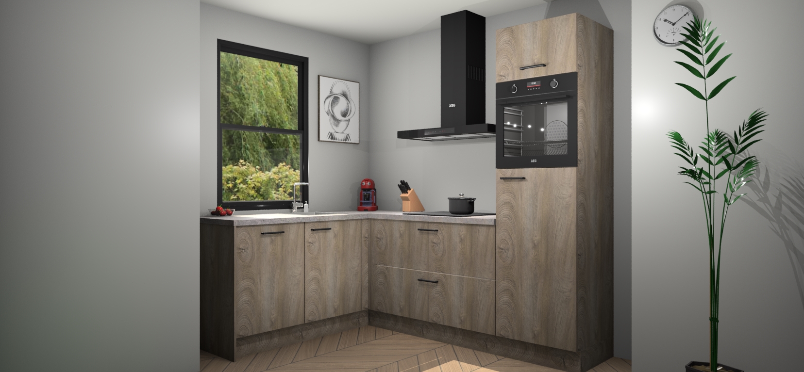 Deze prachtige hoekkeuken heeft alle benodigdheden om uw droomkook- en eetruimte compleet te maken. De Cantaro Eiken kasten bieden een echo van raffinement, terwijl de 5 inbouwapparaten genoeg opties bieden voor het bereiden van heerlijke maaltijden. De oven, inductiekookplaat, afzuigkap, vaatwasser en koelkast zorgen ervoor dat u tijd in de keuken zo efficiënt mogelijk verloopt, terwijl ze ook dat extra vleugje luxe bieden.