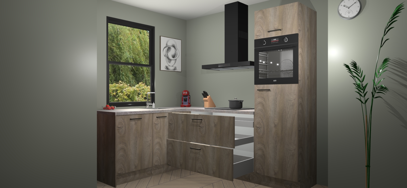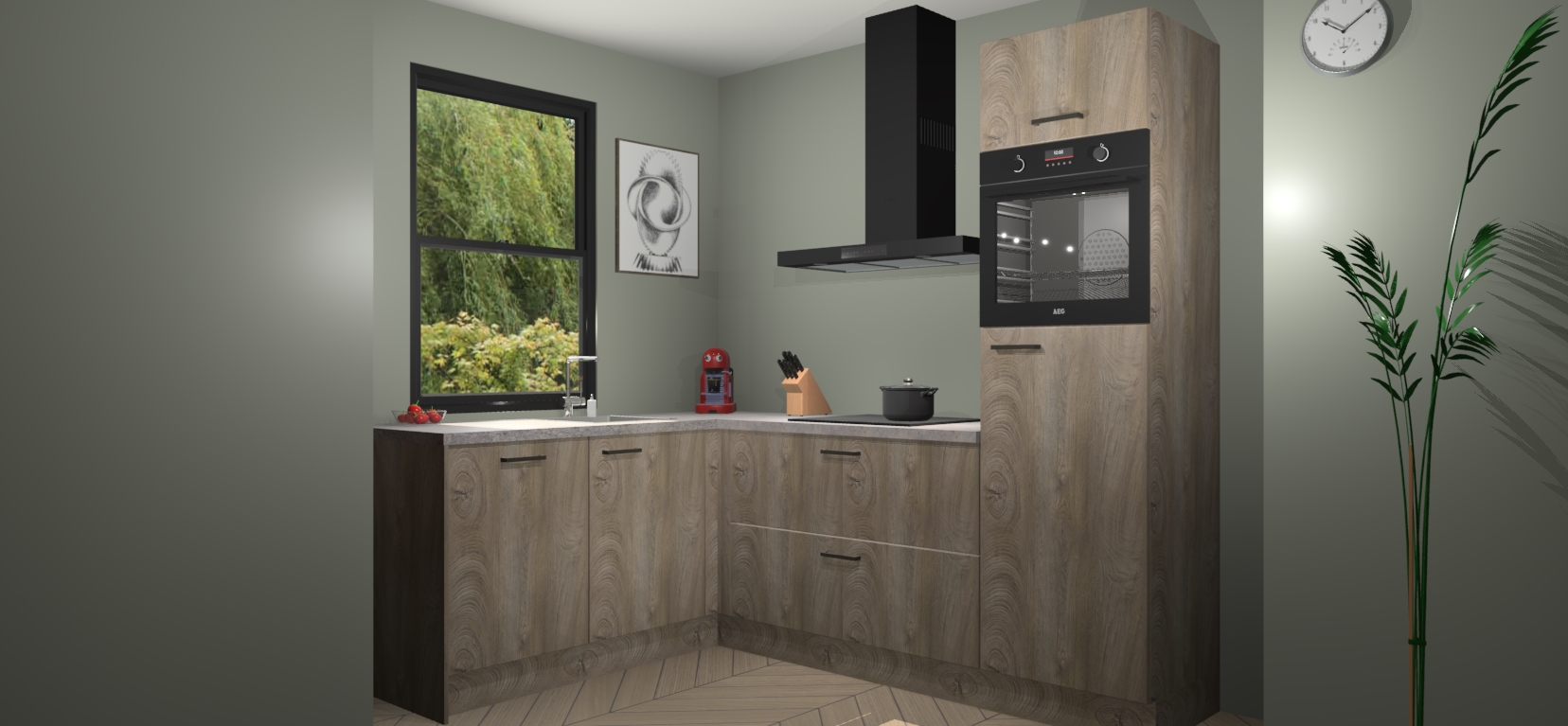 Deze prachtige hoekkeuken heeft alle benodigdheden om uw droomkook- en eetruimte compleet te maken. De Cantaro Eiken kasten bieden een echo van raffinement, terwijl de 5 inbouwapparaten genoeg opties bieden voor het bereiden van heerlijke maaltijden. De oven, inductiekookplaat, afzuigkap, vaatwasser en koelkast zorgen ervoor dat u tijd in de keuken zo efficiënt mogelijk verloopt, terwijl ze ook dat extra vleugje luxe bieden.