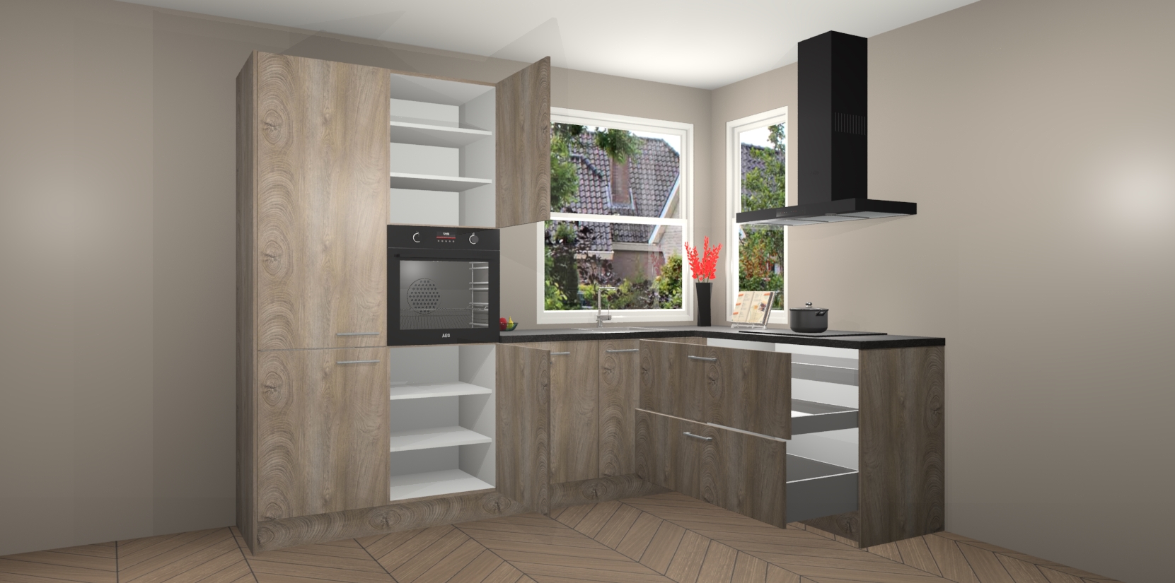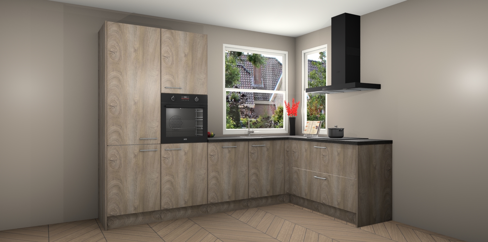 Elke Cantaro Eiken keuken Kotor wordt compleet geleverd met vijf inbouwapparaten, waaronder een oven, inductiekookplaat, afzuigkap, vaatwasser en koelkast. Sterker nog - indien gewenst kunt u deze apparaten na bestelling eenvoudig upgraden naar AEG! Extra functies zijn onder andere soft close deuren voor extra gemak, en elke kast wordt voor gemonteerd geleverd zodat u sneller van uw nieuwe keuken kunt genieten.