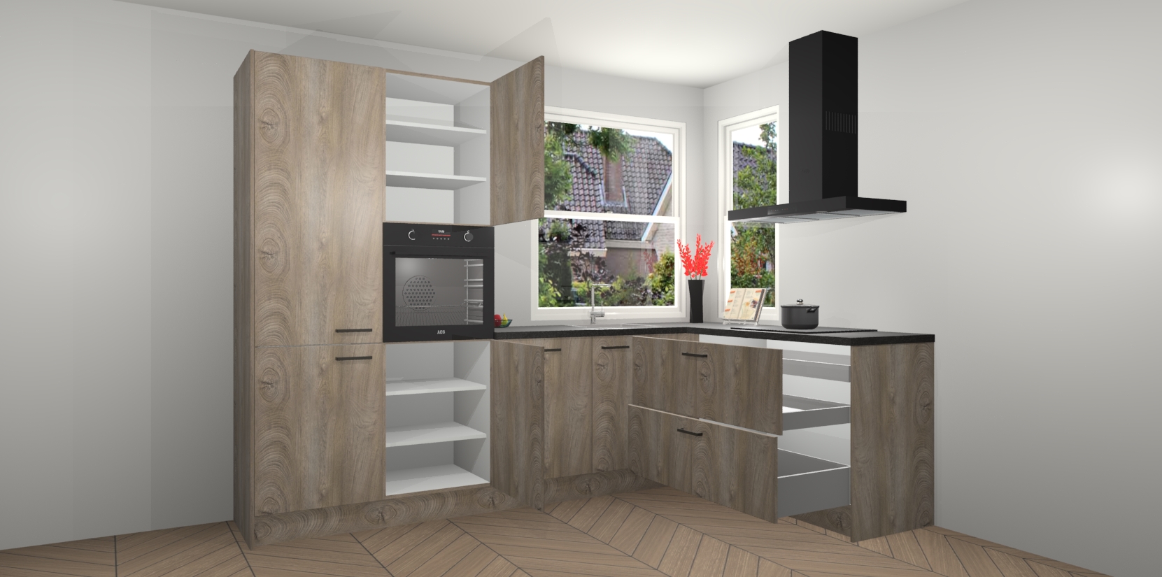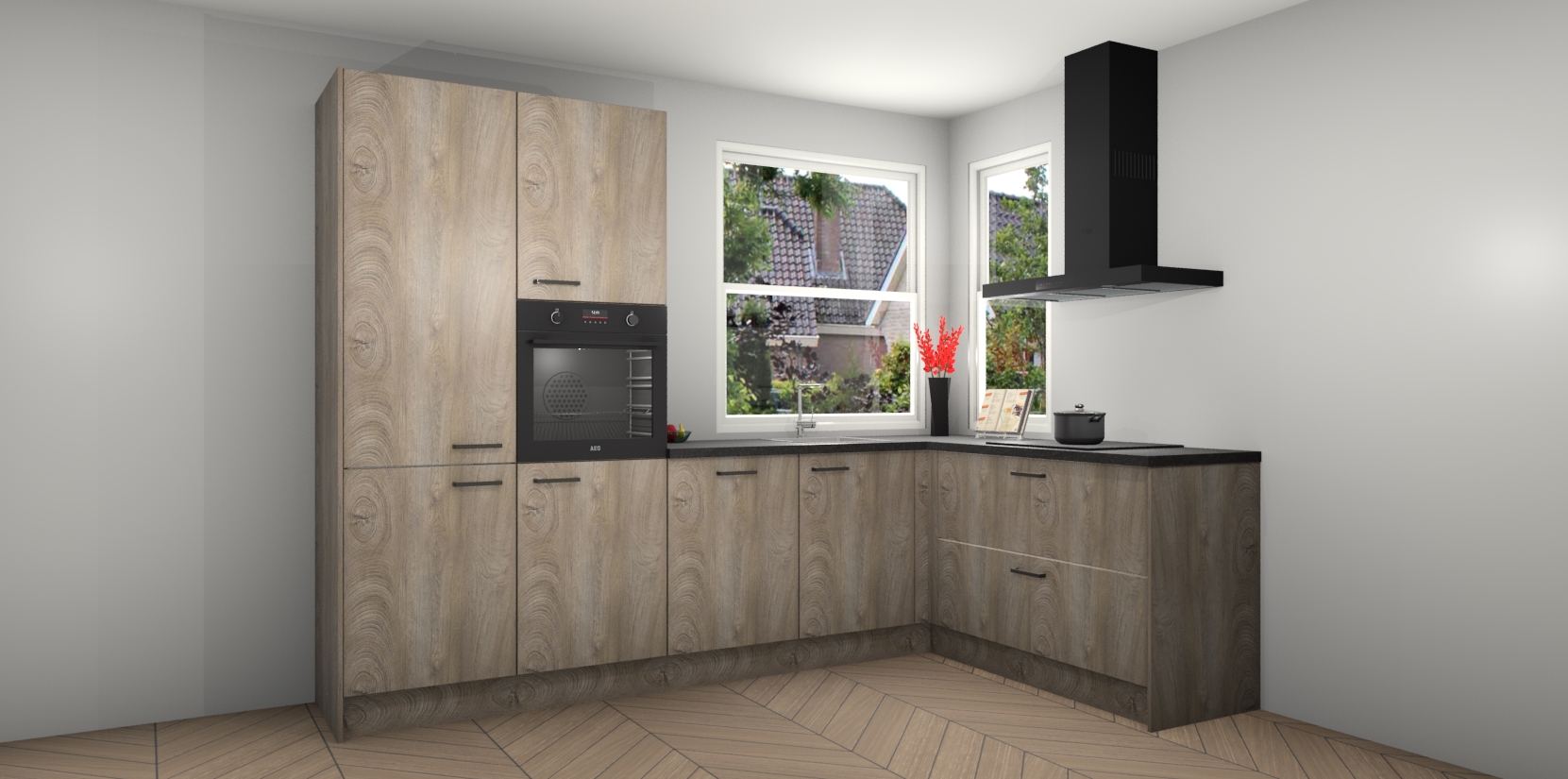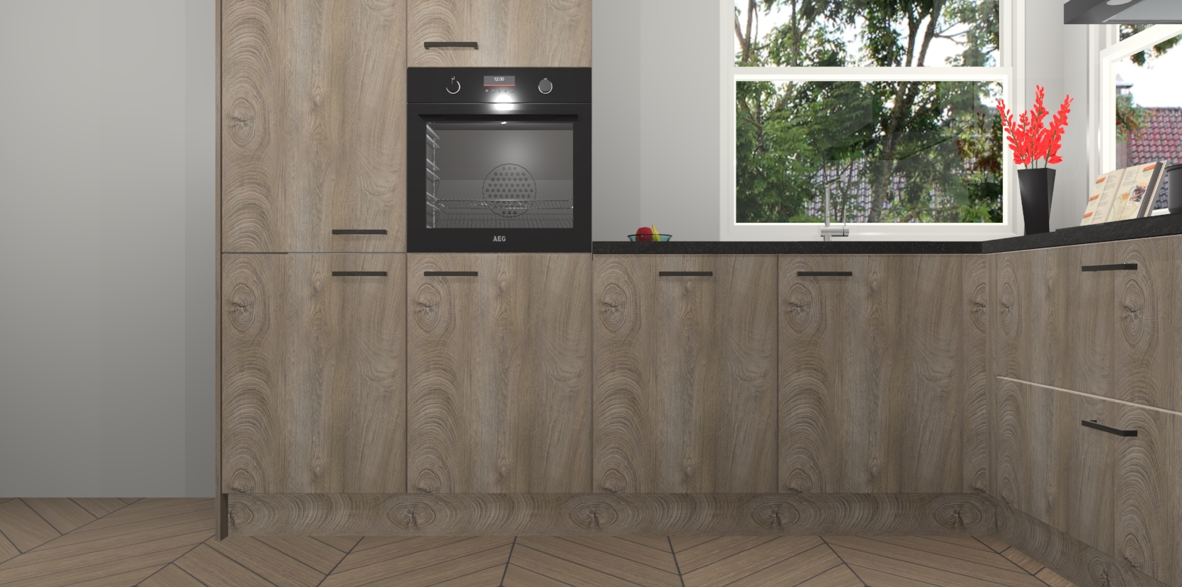 Elke Cantaro Eiken keuken Kotor wordt compleet geleverd met vijf inbouwapparaten, waaronder een oven, inductiekookplaat, afzuigkap, vaatwasser en koelkast. Sterker nog - indien gewenst kunt u deze apparaten na bestelling eenvoudig upgraden naar AEG! Extra functies zijn onder andere soft close deuren voor extra gemak, en elke kast wordt voor gemonteerd geleverd zodat u sneller van uw nieuwe keuken kunt genieten.