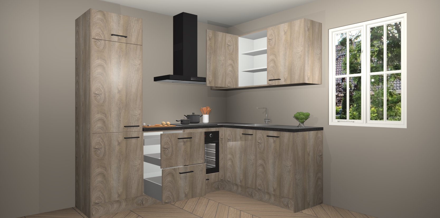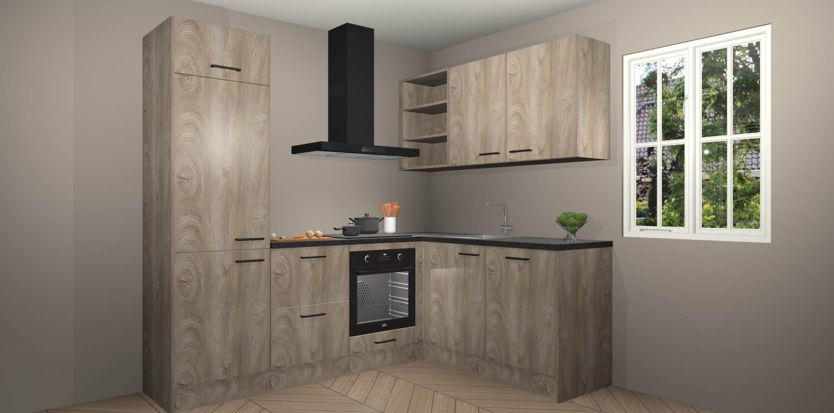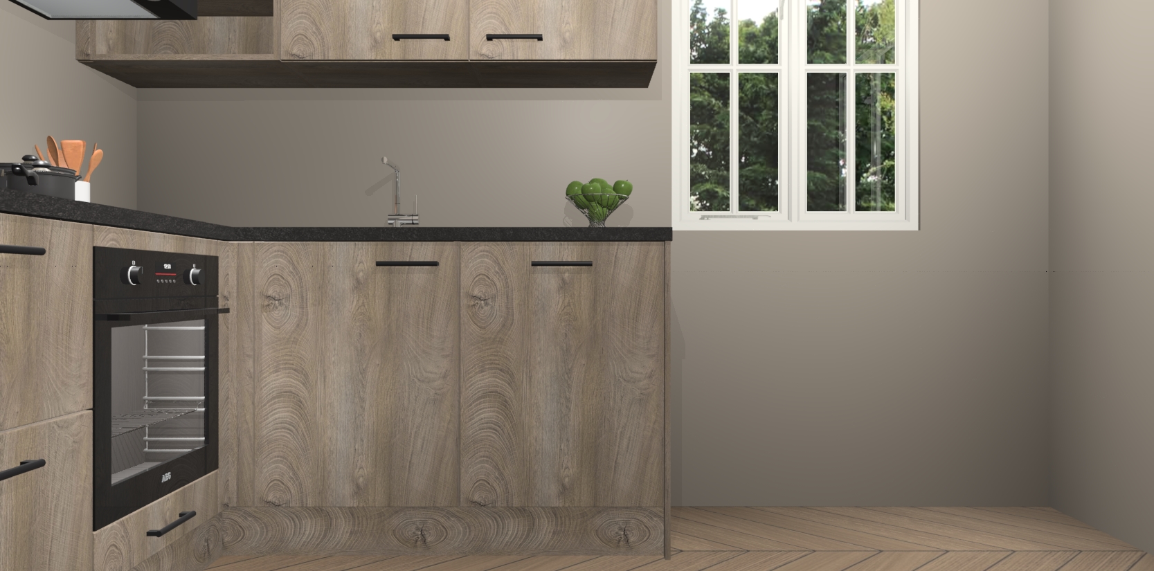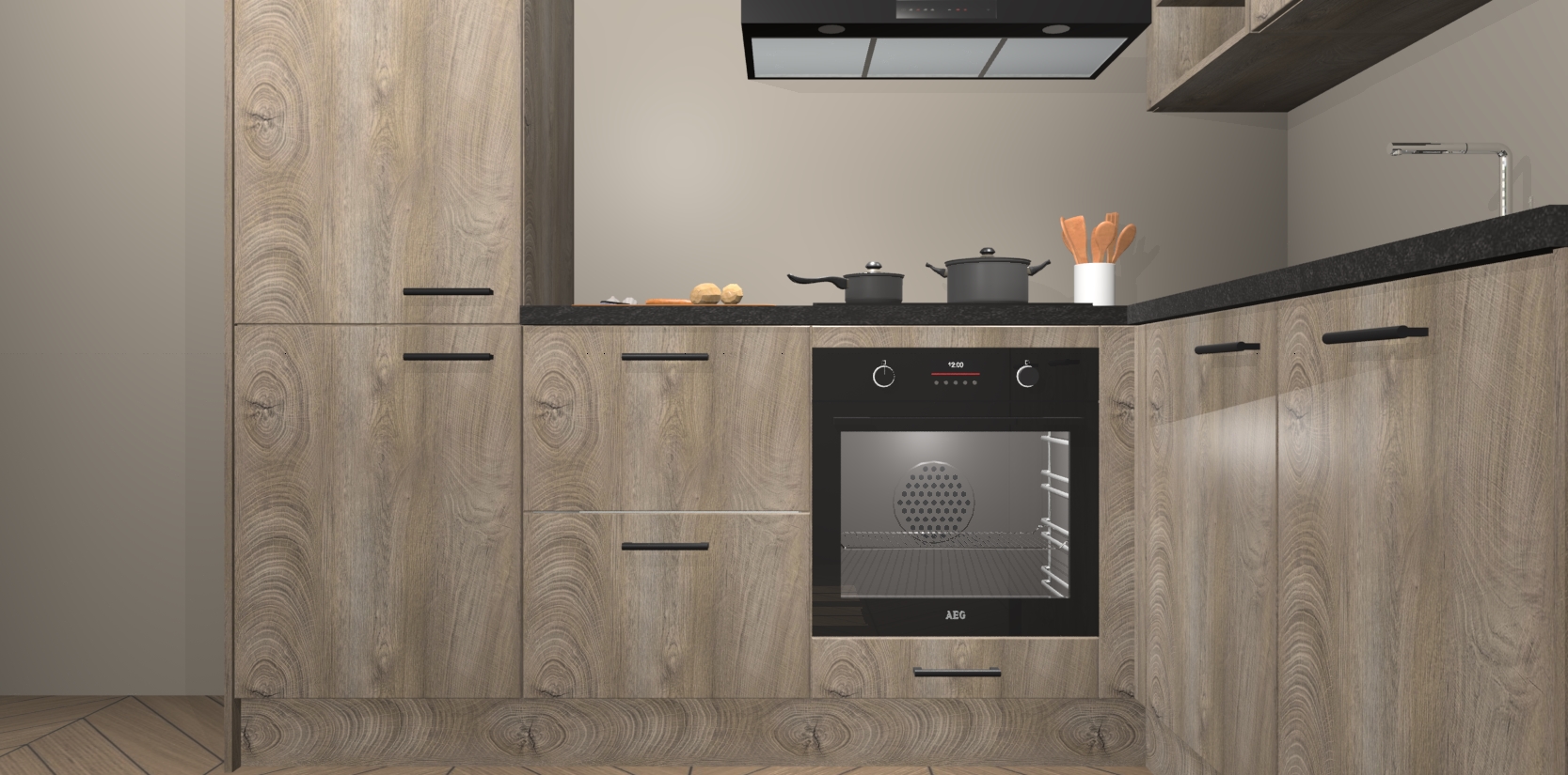 Dit model biedt u voldoende opbergruimte en vijf ingebouwde apparaten: een oven, inductiekookplaat, afzuigkap, vaatwasser en koelkast. Deze apparaten kunnen gemakkelijk worden geüpgrade naar AEG nadat u besteld heeft. De verschillende laden en kastjes bevatten softclose-deuren waardoor ze gezellig dichtvallen met een geruststellend helemaal geruisloos geluid. En dat is nog niet alles! We garanderen ook dat de prijs altijd laag blijft - dus haal nu uw Cantaro Eiken keuken Krakau terwijl het kan.