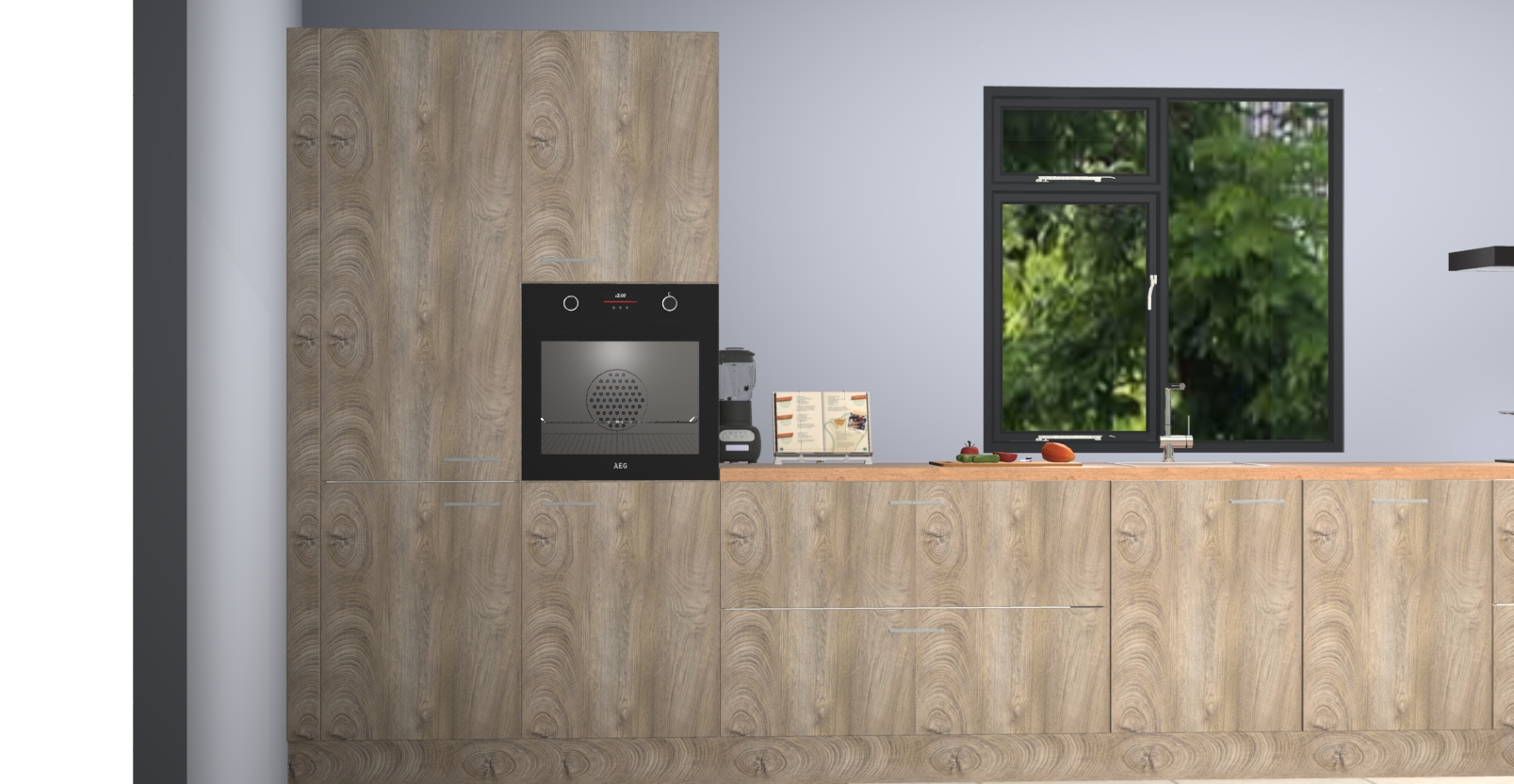 De Cantaro eiken keuken Lille wordt geleverd met vijf inbouwapparaten - een oven, inductiekookplaat, afzuigkap, vaatwasser en koelkast. Maar dat is nog niet alles! Na bestelling kunnen deze apparaten eenvoudig worden geüpgraded naar premium AEG-apparatuur. Bovendien is er zelfs de optie om de oven te vervangen door een combimagnetron of uw inductiekookplaat te vervangen door een kookplaat met geïntegreerde afzuiging.
