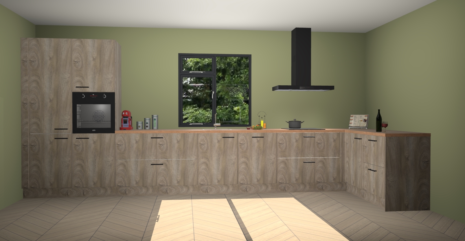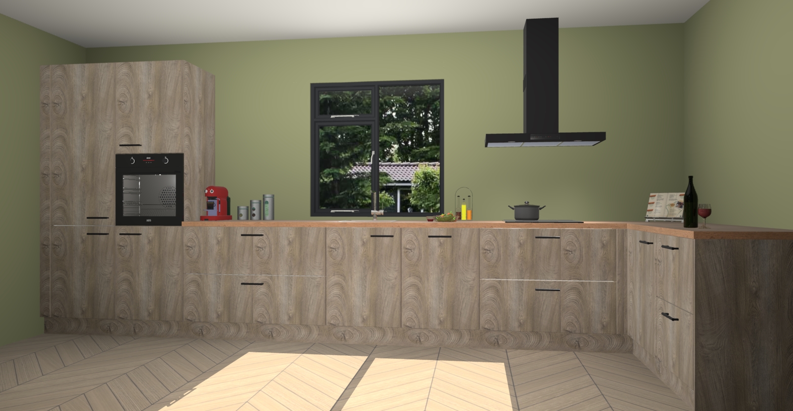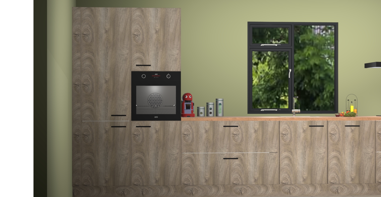 De Cantaro eiken keuken Lille wordt geleverd met vijf inbouwapparaten - een oven, inductiekookplaat, afzuigkap, vaatwasser en koelkast. Maar dat is nog niet alles! Na bestelling kunnen deze apparaten eenvoudig worden geüpgraded naar premium AEG-apparatuur. Bovendien is er zelfs de optie om de oven te vervangen door een combimagnetron of uw inductiekookplaat te vervangen door een kookplaat met geïntegreerde afzuiging.