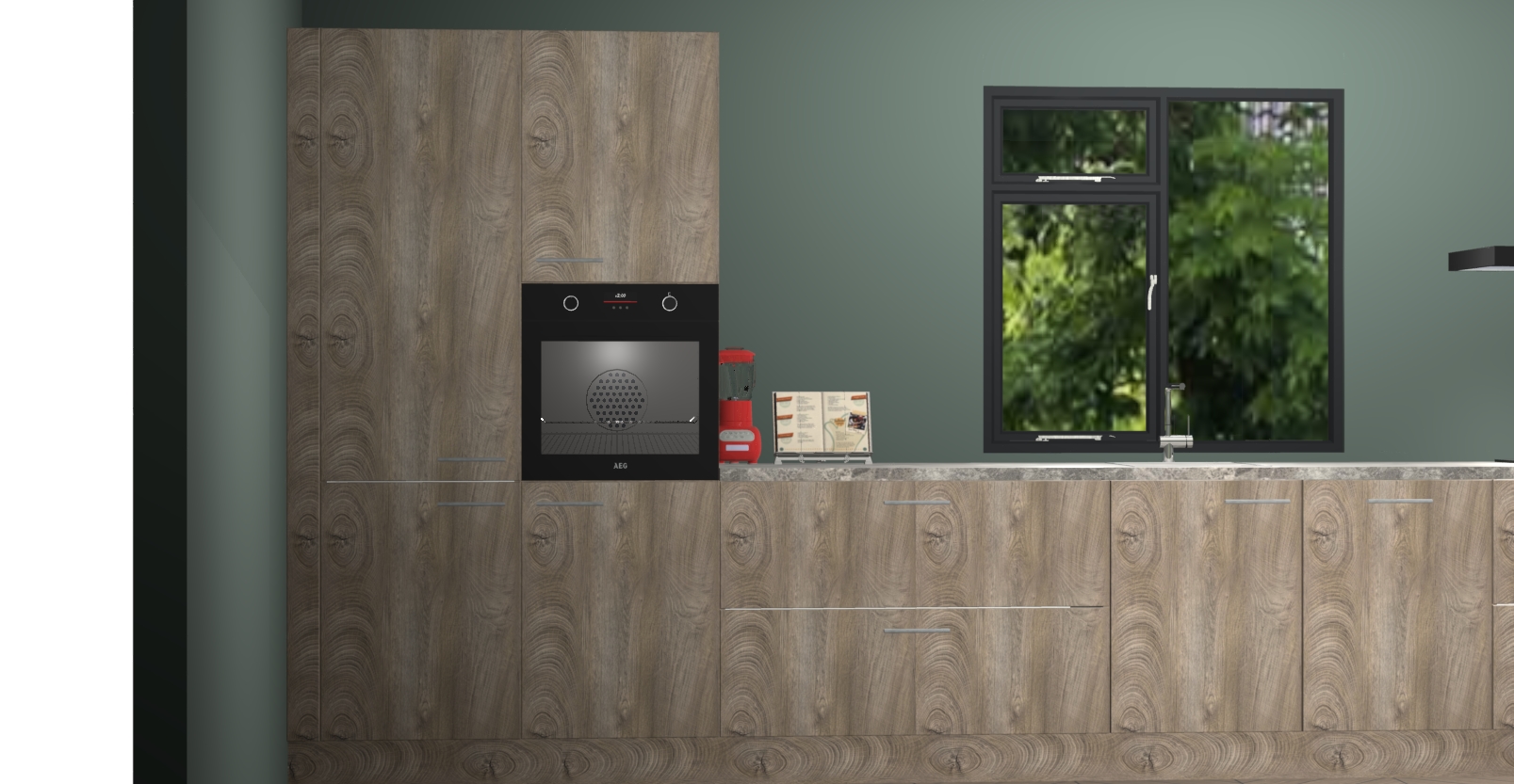De Cantaro eiken keuken Lille wordt geleverd met vijf inbouwapparaten - een oven, inductiekookplaat, afzuigkap, vaatwasser en koelkast. Maar dat is nog niet alles! Na bestelling kunnen deze apparaten eenvoudig worden geüpgraded naar premium AEG-apparatuur. Bovendien is er zelfs de optie om de oven te vervangen door een combimagnetron of uw inductiekookplaat te vervangen door een kookplaat met geïntegreerde afzuiging.