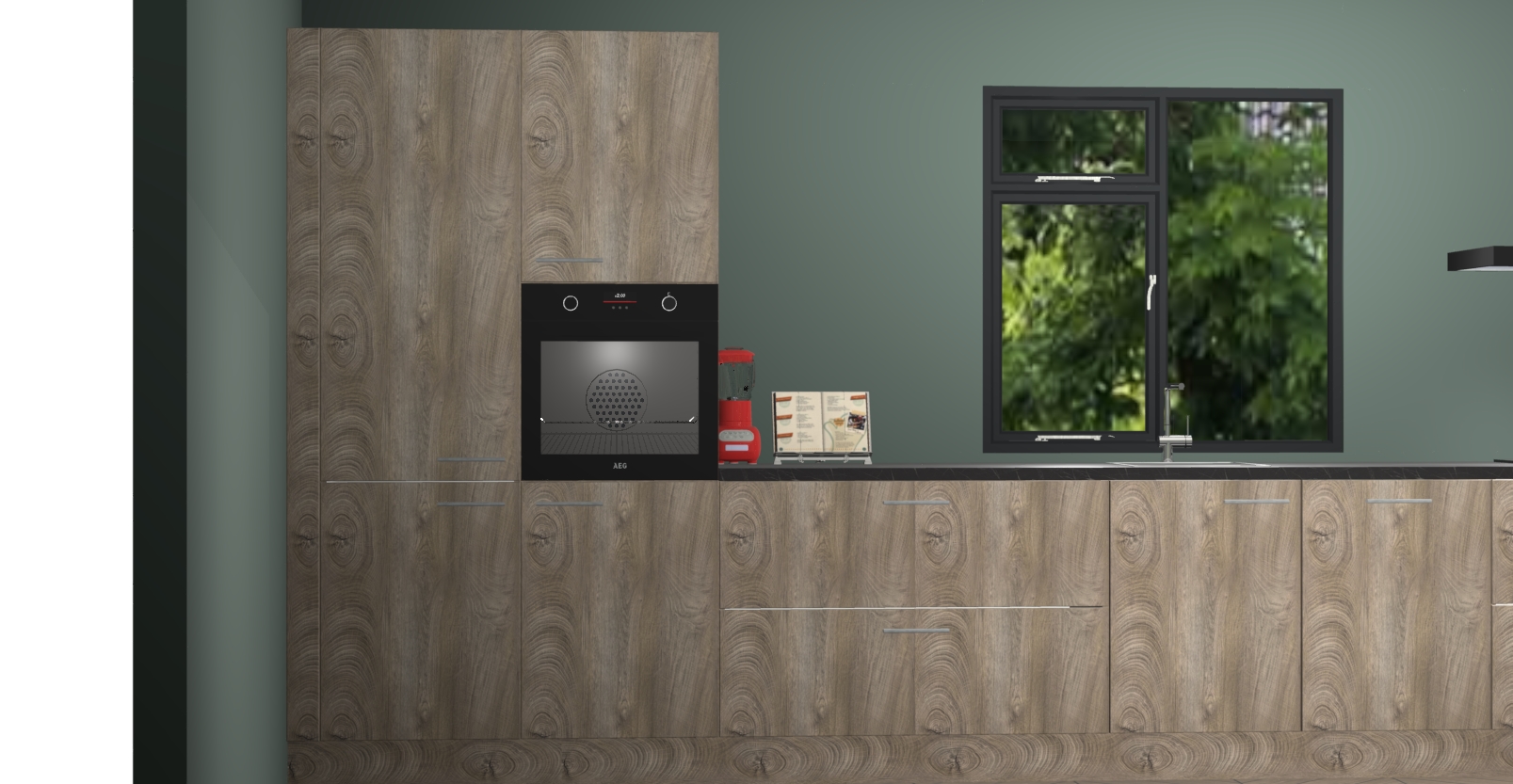 De Cantaro eiken keuken Lille wordt geleverd met vijf inbouwapparaten - een oven, inductiekookplaat, afzuigkap, vaatwasser en koelkast. Maar dat is nog niet alles! Na bestelling kunnen deze apparaten eenvoudig worden geüpgraded naar premium AEG-apparatuur. Bovendien is er zelfs de optie om de oven te vervangen door een combimagnetron of uw inductiekookplaat te vervangen door een kookplaat met geïntegreerde afzuiging.
