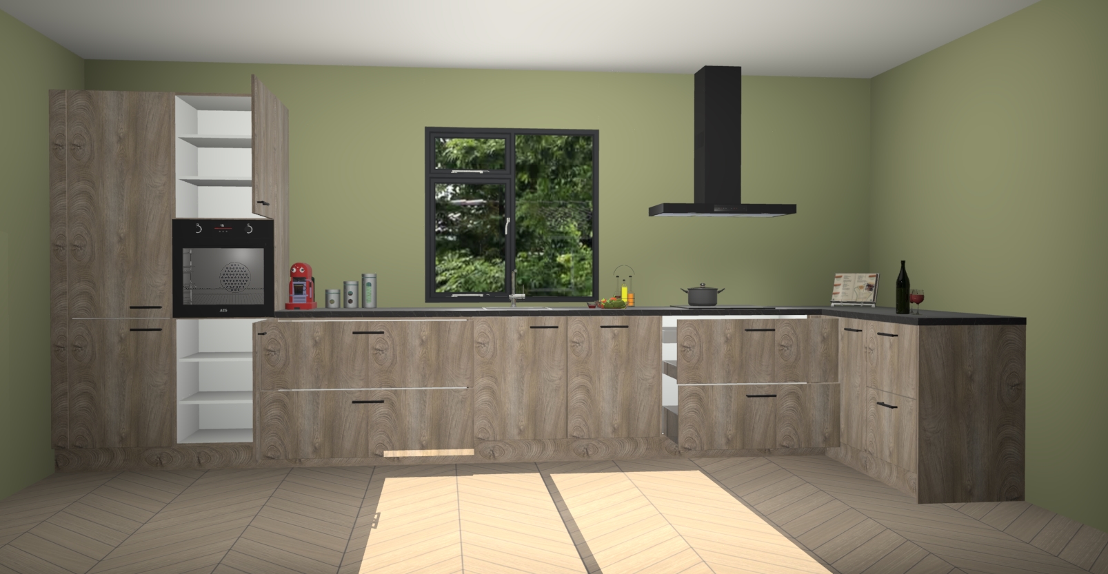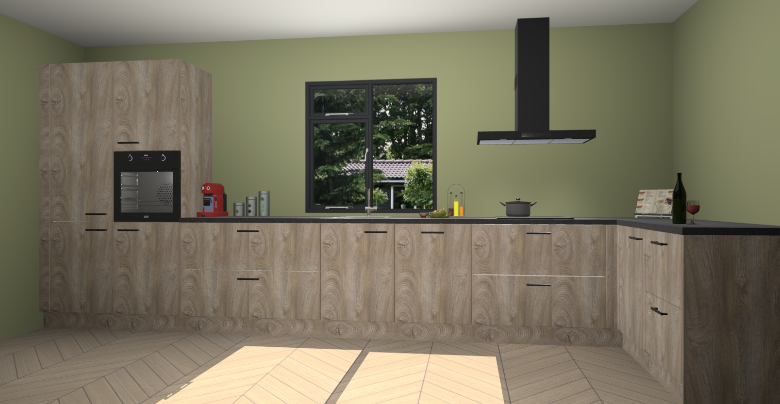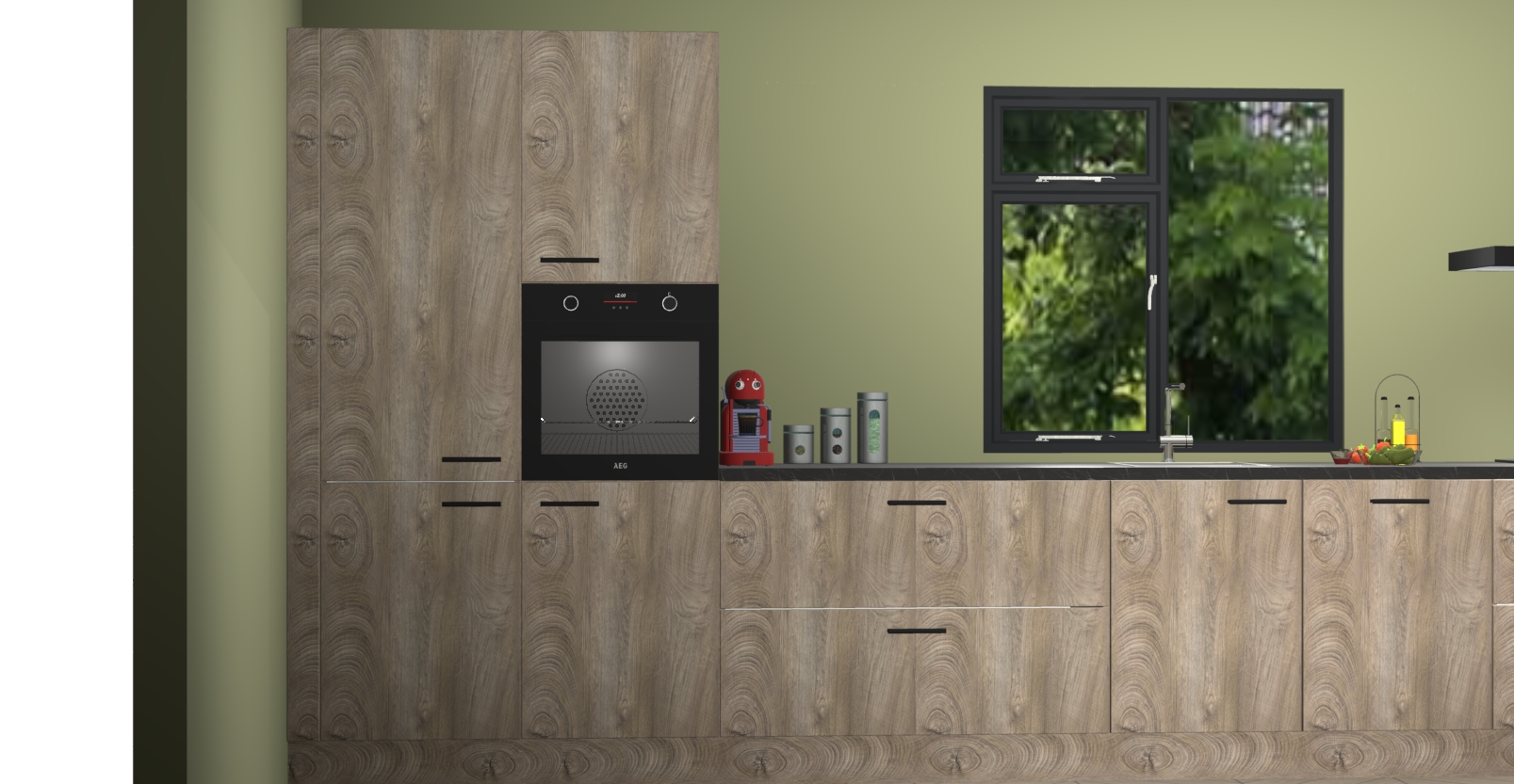 De Cantaro eiken keuken Lille wordt geleverd met vijf inbouwapparaten - een oven, inductiekookplaat, afzuigkap, vaatwasser en koelkast. Maar dat is nog niet alles! Na bestelling kunnen deze apparaten eenvoudig worden geüpgraded naar premium AEG-apparatuur. Bovendien is er zelfs de optie om de oven te vervangen door een combimagnetron of uw inductiekookplaat te vervangen door een kookplaat met geïntegreerde afzuiging.