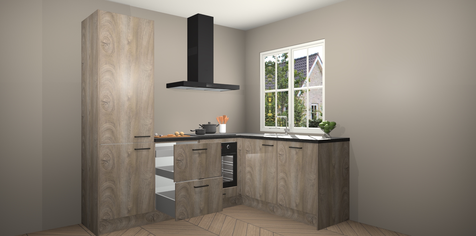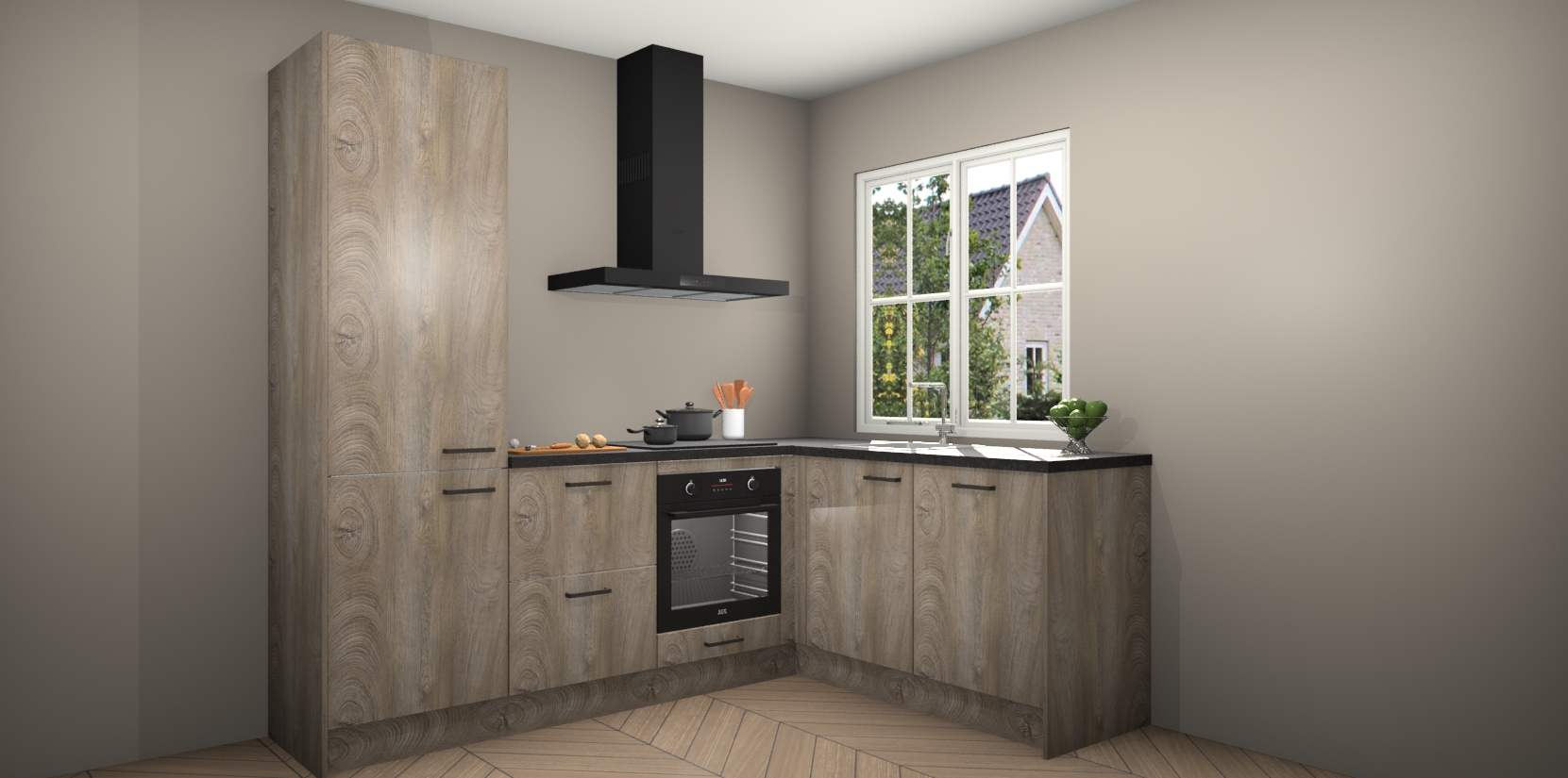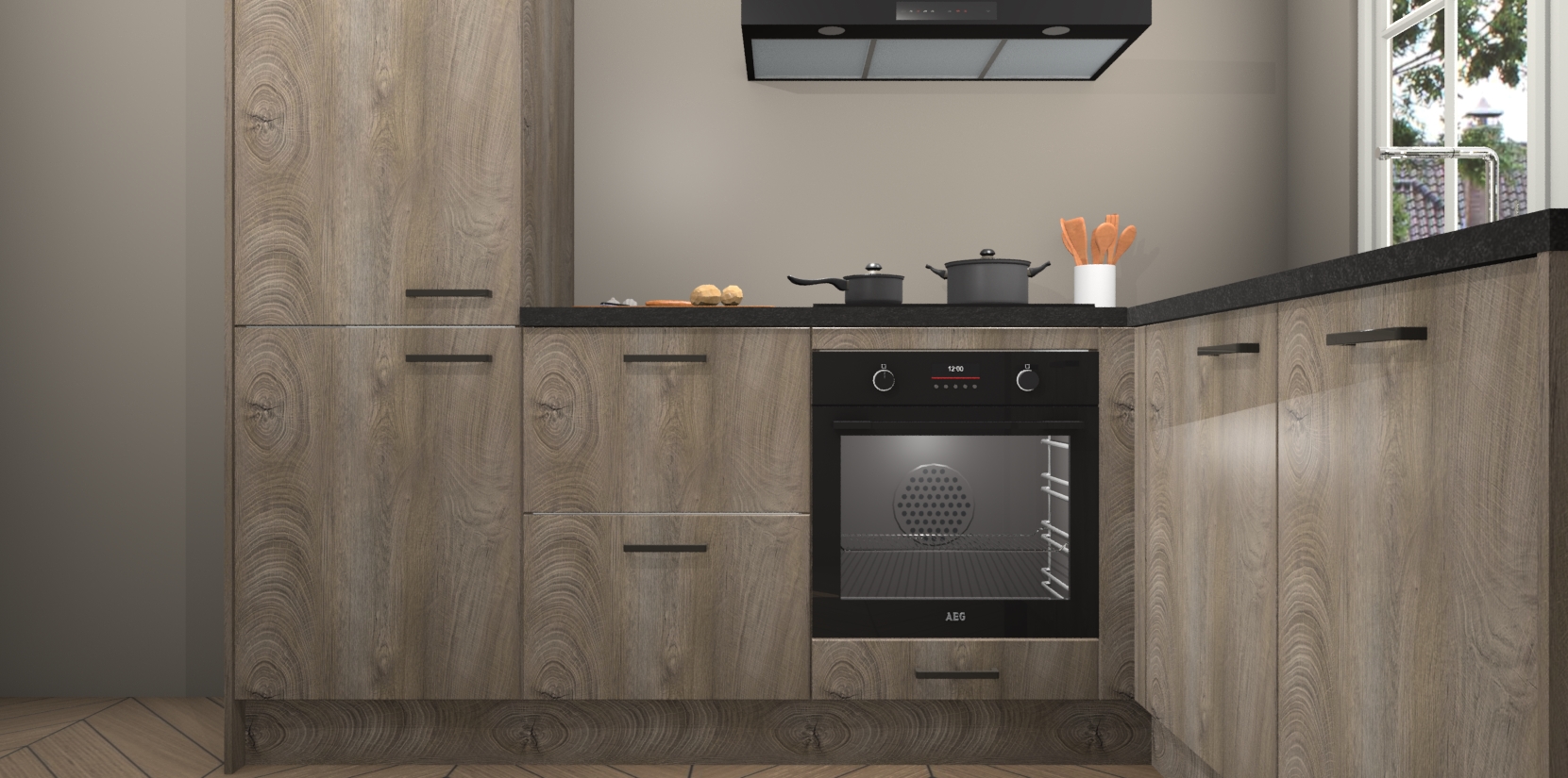 De Cantaro Eiken keuken Linz is de perfecte keuze voor uw nieuwe moderne en tijdloze keuken. Ga voor moderne en tijdloze elegantie in uw keuken. De prachtige hoekkeuken biedt een verfrissende kijk op de manier waarop we ons vertrouwde keukenontwerp kunnen aanpassen in een nieuwe stijl.  Één blik om alles te zien: zo mooi dat het bijna magisch lijkt.