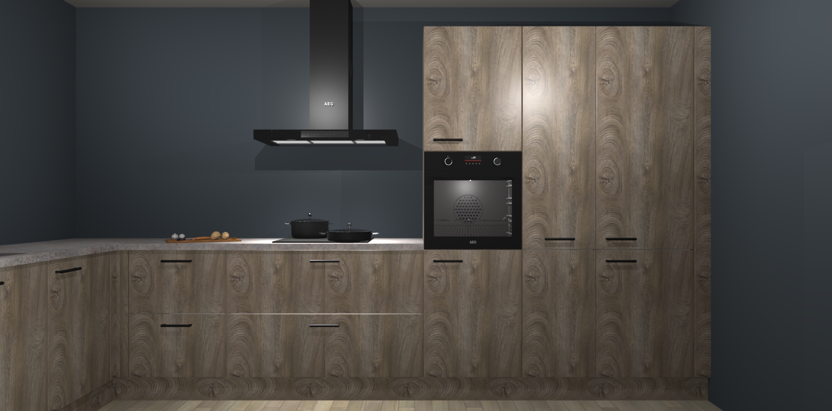 Welkom bij de cantaro eiken keuken Nuuk. Deze prachtige keuken zal de komende jaren het middelpunt van de belangstelling in uw huis zijn. Uitgerust met vijf inbouwapparaten komt u nooit kookgereedschap tekort.