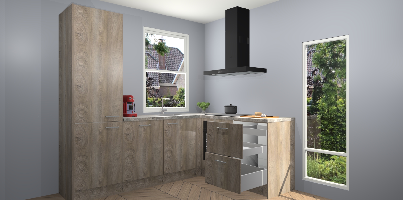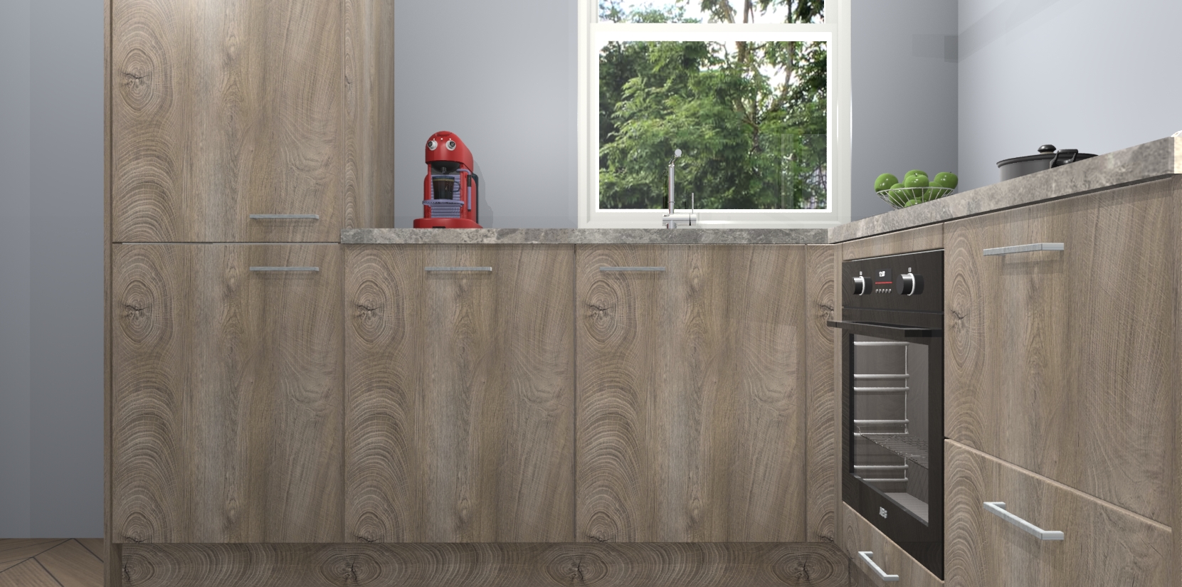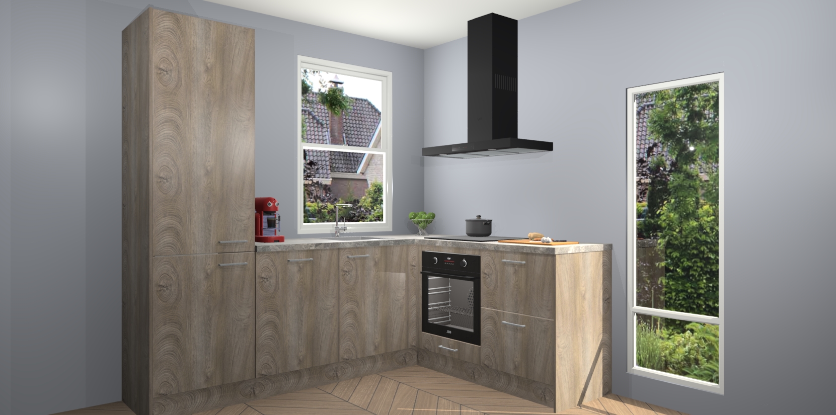 De prachtige Cantaro Eiken keuken Phuket is de perfecte keuze als u op zoek bent naar een moderne hoekkeuken met alle luxe en comfort die u kunt verwachten! De uitstraling in het houtlook-design draagt bij aan de warme sfeer die u nu al voelt wanneer u er naar kijkt. Heeft u genoeg van ouderwetse keukens? Probeer dan direct deze moderne, mooie hoekkeukens en laat iedereen verbluft achter!