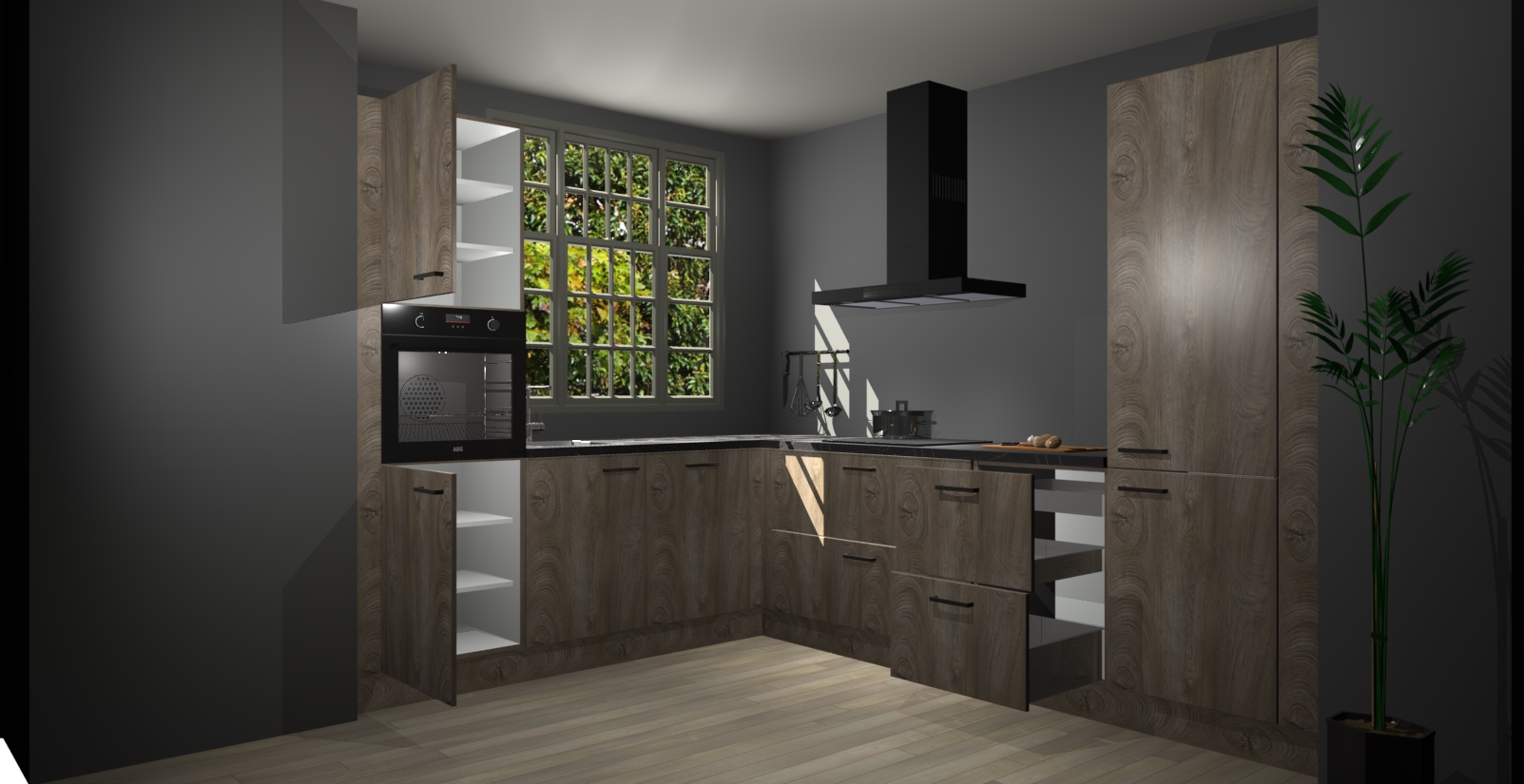 Met een modern, tijdloos design en ruime opslagruimte, zult u zich in no-time thuis voelen in uw nieuwe keuken. Uw leven wordt eenvoudiger met de soft-close deuren die voor het ultieme stille comfort zorgen - geen geluid dat u stoort terwijl u kookt. Ook is de keuken voorzien van 5 ingebouwde apparaten: een oven, inductie kookplaat, afzuigkap, vaatwasser en koelkast. Deze kunnen gemakkelijk na bestelling worden bijgewerkt naar AEG - waardoor uw luxe ervaring compleet is.