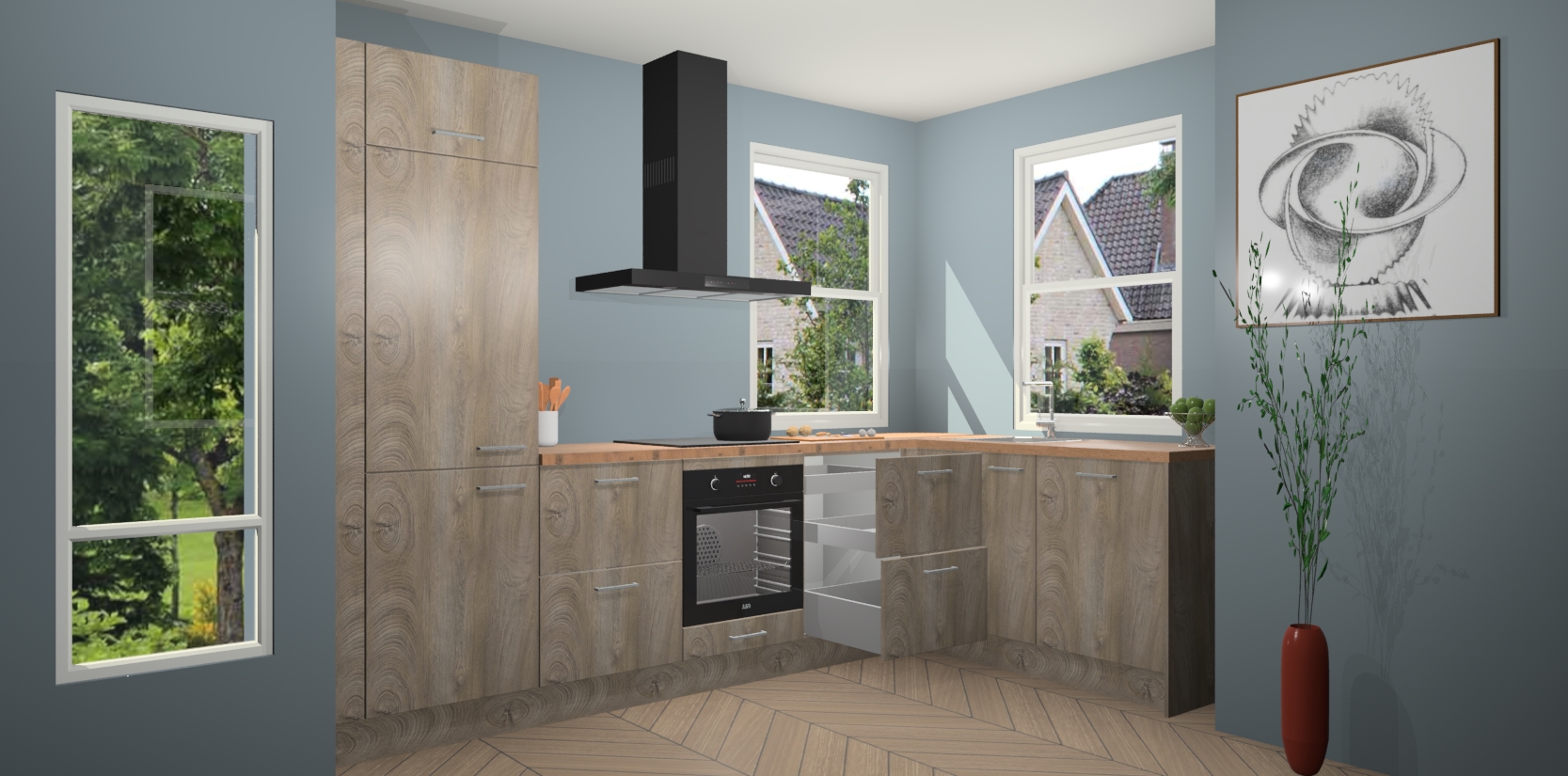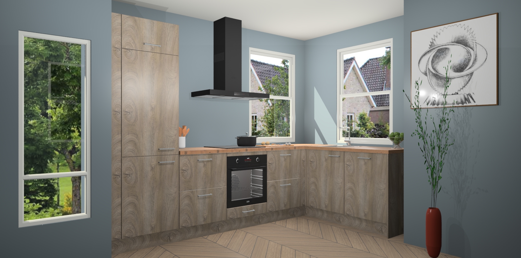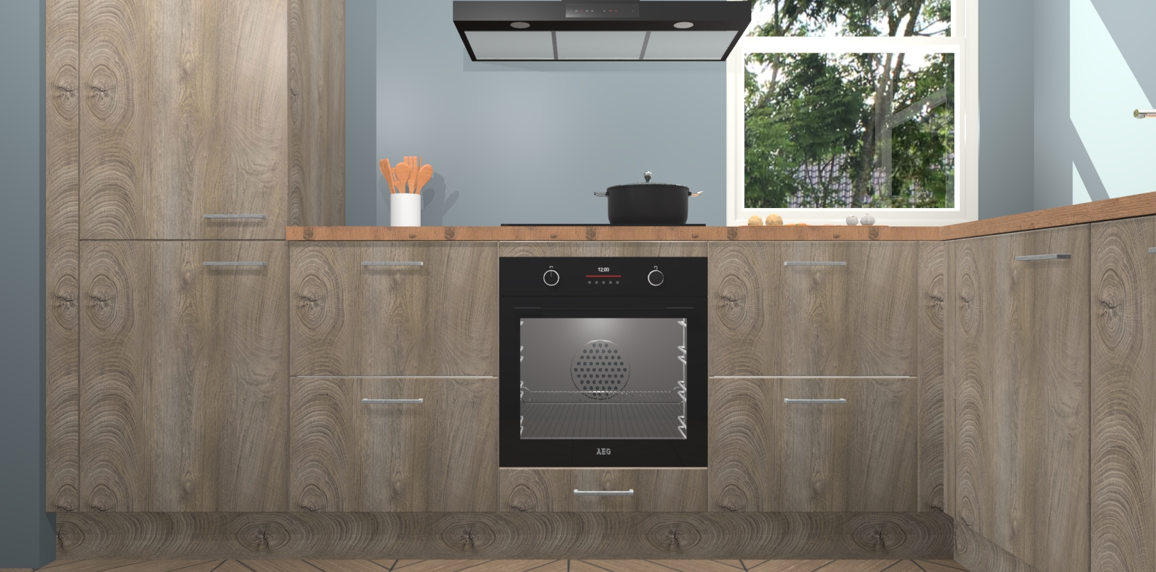 Wat maakt deze keuken zo bijzonder? Ten eerste geeft het houten werkblad uw ruimte een onmiskenbaar klassieke uitstraling. De natuurlijke afwerking roept warmte en elegantie op die nooit uit de mode zullen raken. Bovendien is het gemakkelijk schoon te houden en te onderhouden, zodat je er jarenlang plezier van kunt hebben. Als u op zoek bent naar extra gemak in uw keuken, dan heeft u bij het plaatsen van een bestelling bij ons ook de optie om uw toestellen te upgraden naar AEG-modellen - zo haalt u moderne innovatie van topmerken in apparatentechnologie rechtstreeks in huis.