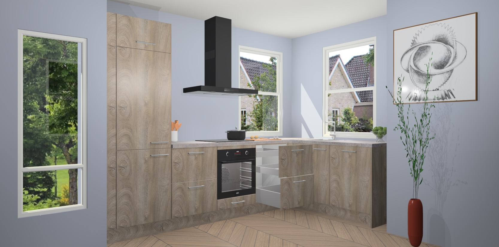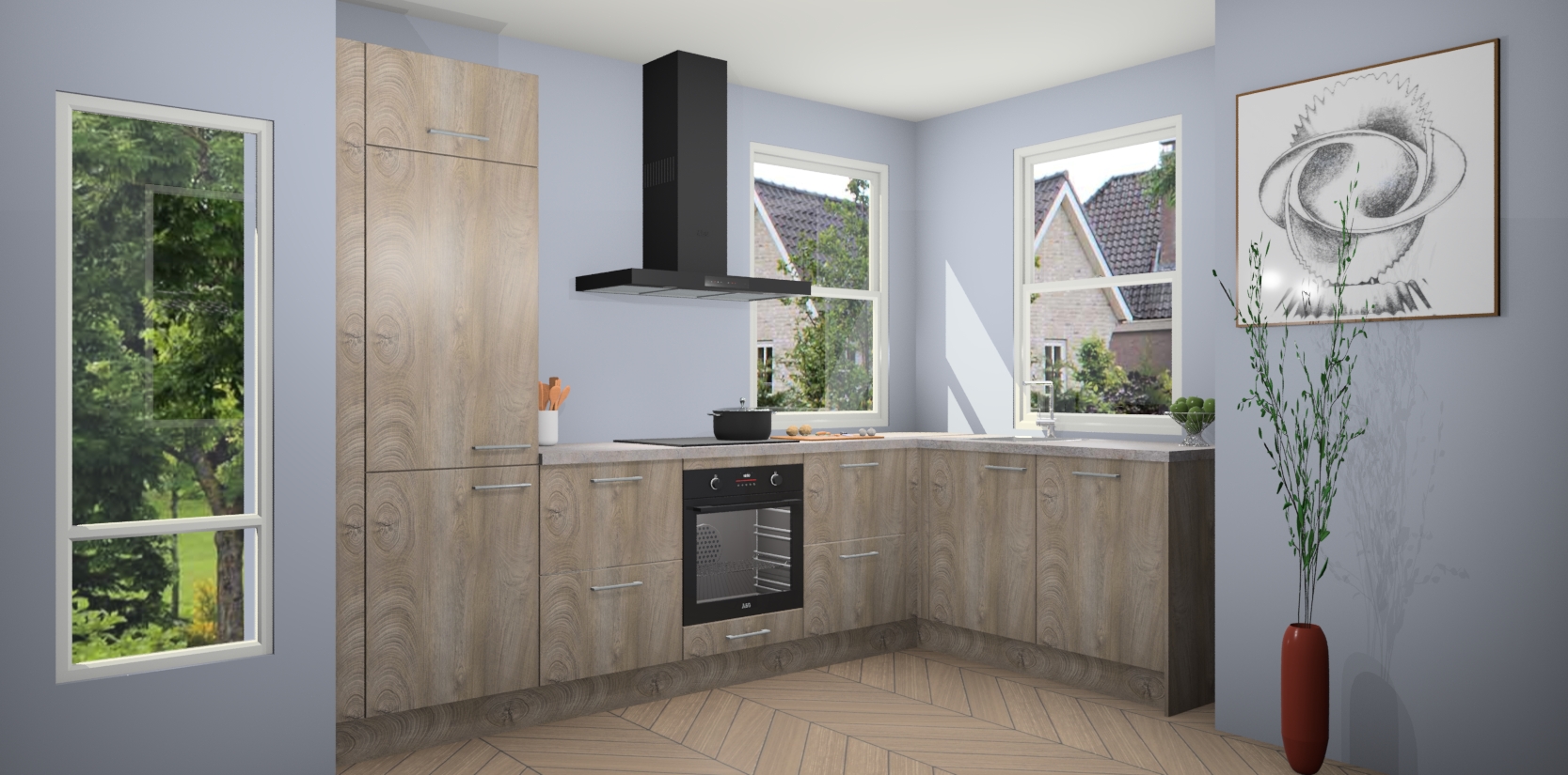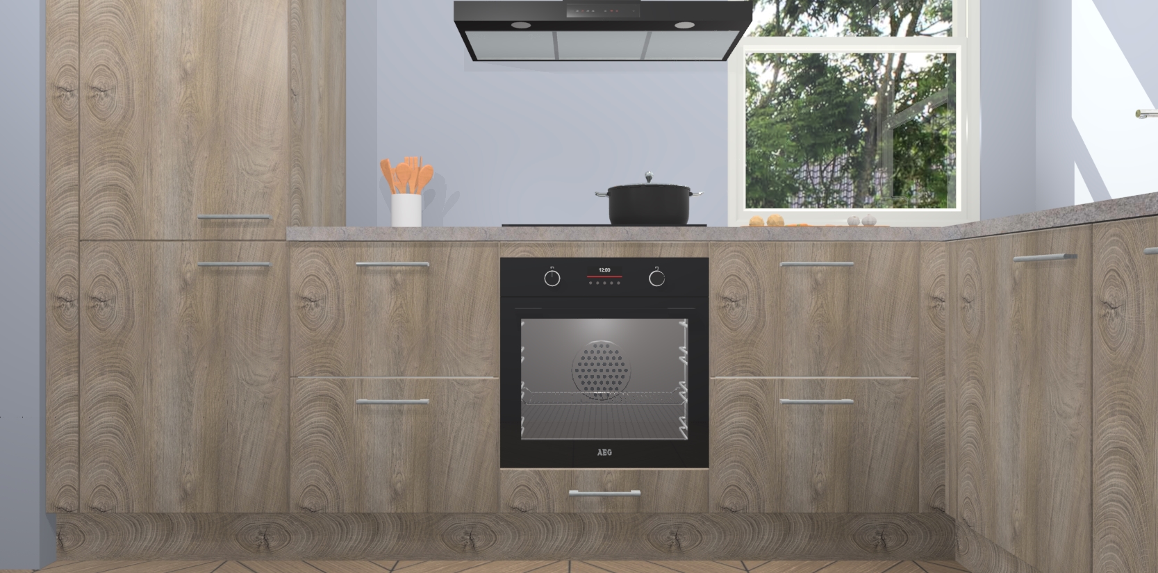 Wat maakt deze keuken zo bijzonder? Ten eerste geeft het houten werkblad uw ruimte een onmiskenbaar klassieke uitstraling. De natuurlijke afwerking roept warmte en elegantie op die nooit uit de mode zullen raken. Bovendien is het gemakkelijk schoon te houden en te onderhouden, zodat je er jarenlang plezier van kunt hebben. Als u op zoek bent naar extra gemak in uw keuken, dan heeft u bij het plaatsen van een bestelling bij ons ook de optie om uw toestellen te upgraden naar AEG-modellen - zo haalt u moderne innovatie van topmerken in apparatentechnologie rechtstreeks in huis.