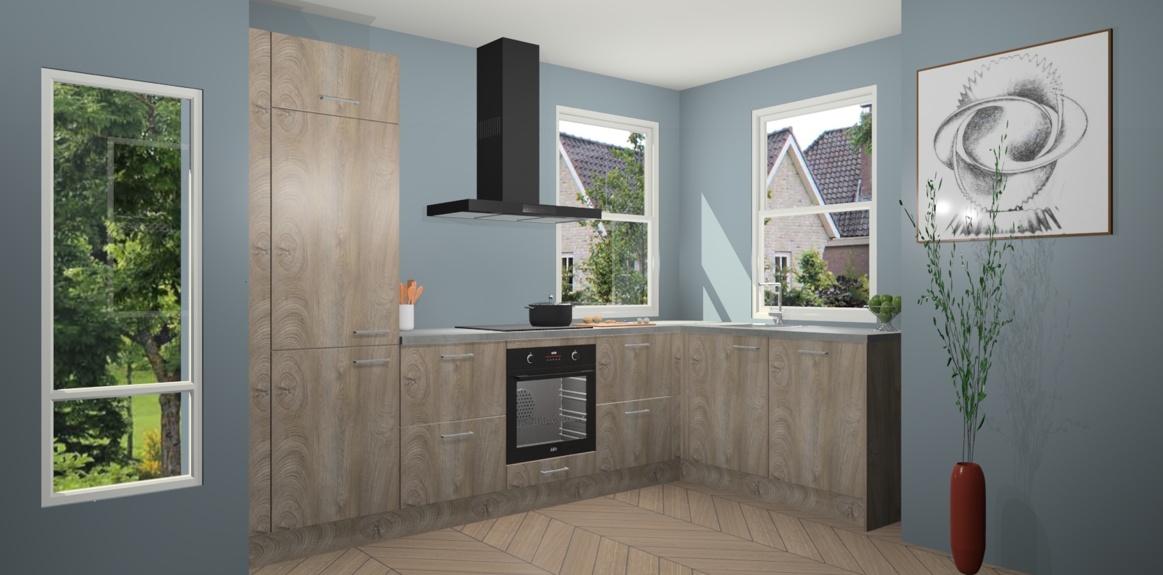 Wat maakt deze keuken zo bijzonder? Ten eerste geeft het houten werkblad uw ruimte een onmiskenbaar klassieke uitstraling. De natuurlijke afwerking roept warmte en elegantie op die nooit uit de mode zullen raken. Bovendien is het gemakkelijk schoon te houden en te onderhouden, zodat je er jarenlang plezier van kunt hebben. Als u op zoek bent naar extra gemak in uw keuken, dan heeft u bij het plaatsen van een bestelling bij ons ook de optie om uw toestellen te upgraden naar AEG-modellen - zo haalt u moderne innovatie van topmerken in apparatentechnologie rechtstreeks in huis.