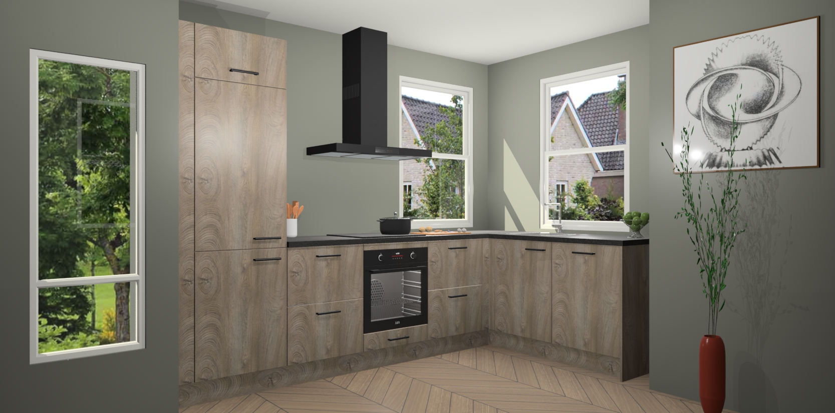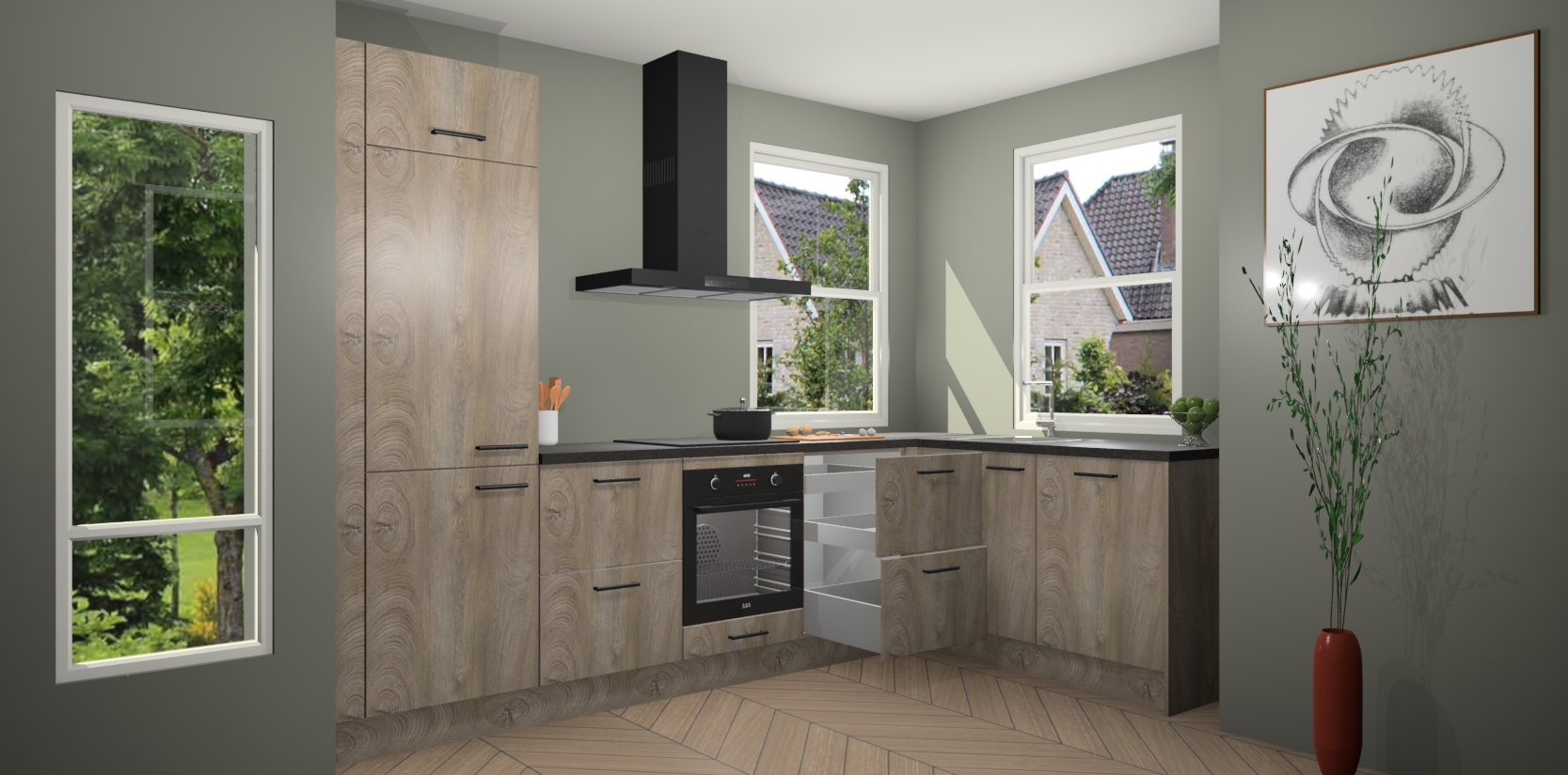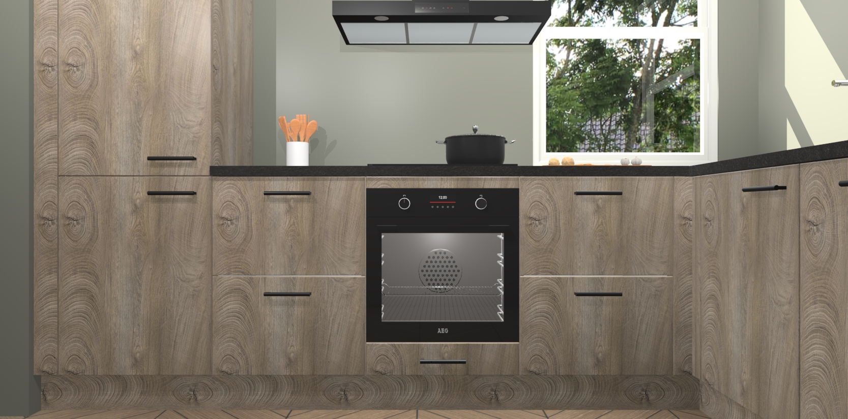 Wat maakt deze keuken zo bijzonder? Ten eerste geeft het houten werkblad uw ruimte een onmiskenbaar klassieke uitstraling. De natuurlijke afwerking roept warmte en elegantie op die nooit uit de mode zullen raken. Bovendien is het gemakkelijk schoon te houden en te onderhouden, zodat je er jarenlang plezier van kunt hebben. Als u op zoek bent naar extra gemak in uw keuken, dan heeft u bij het plaatsen van een bestelling bij ons ook de optie om uw toestellen te upgraden naar AEG-modellen - zo haalt u moderne innovatie van topmerken in apparatentechnologie rechtstreeks in huis.