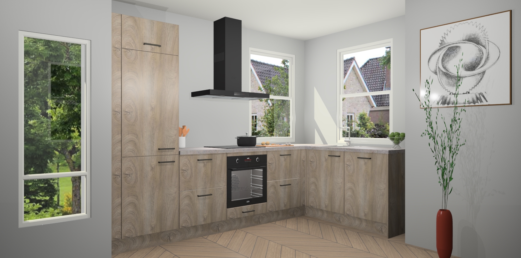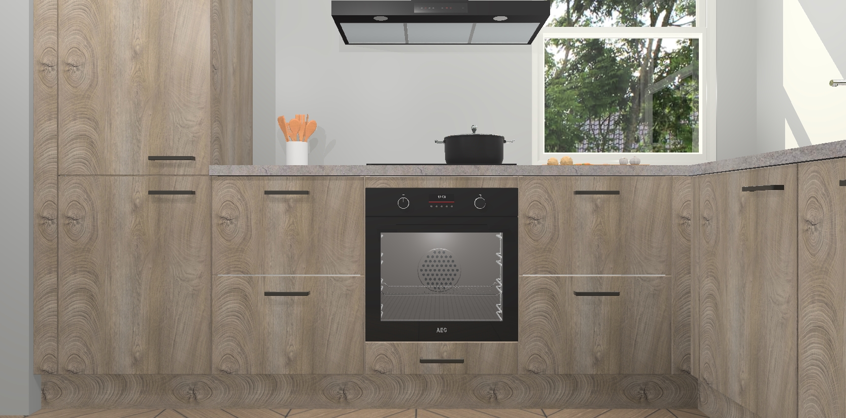 Wat maakt deze keuken zo bijzonder? Ten eerste geeft het houten werkblad uw ruimte een onmiskenbaar klassieke uitstraling. De natuurlijke afwerking roept warmte en elegantie op die nooit uit de mode zullen raken. Bovendien is het gemakkelijk schoon te houden en te onderhouden, zodat je er jarenlang plezier van kunt hebben. Als u op zoek bent naar extra gemak in uw keuken, dan heeft u bij het plaatsen van een bestelling bij ons ook de optie om uw toestellen te upgraden naar AEG-modellen - zo haalt u moderne innovatie van topmerken in apparatentechnologie rechtstreeks in huis.
