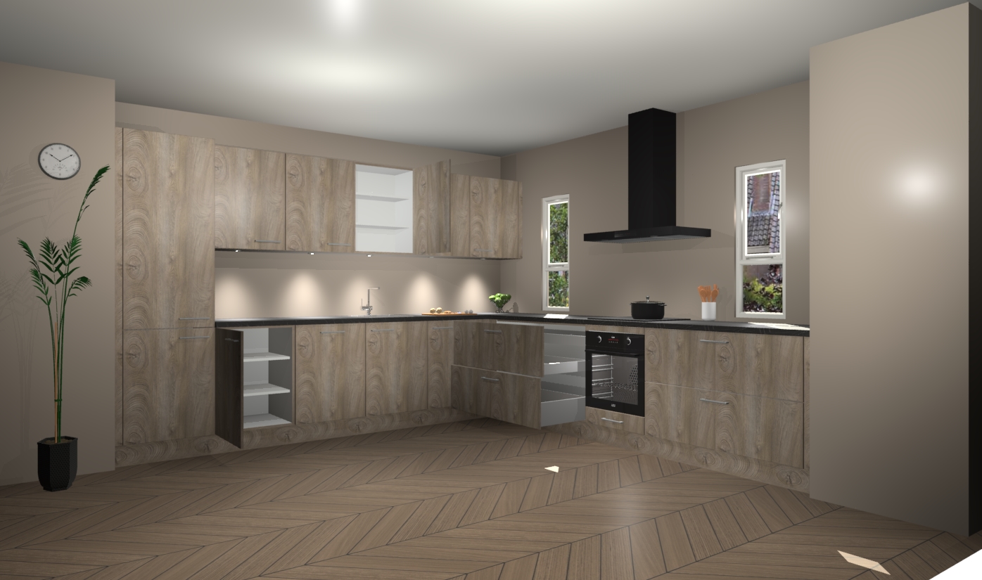 De cantaro eiken keuken is een ideale hoekkeuken en heeft alle functies en apparatuur die u maar nodig kunt hebben. Bij de bestelling krijgt u een oven, inductiekookplaat, afzuigkap, vaatwasser en koelkast - deze kunnen desgewenst eenvoudig worden uitgebreid naar AEG na bestellen. Elke kast wordt ook voor gemonteerd geleverd met soft close deuren die jarenlang gebruik beloven. Stelt u zich voor dat u geen gedoe heeft met vervelende montage - vanaf het moment dat u uw bestelling plaats, duurt het slechts 7 weken voor het bij u thuis geleverd wordt.
