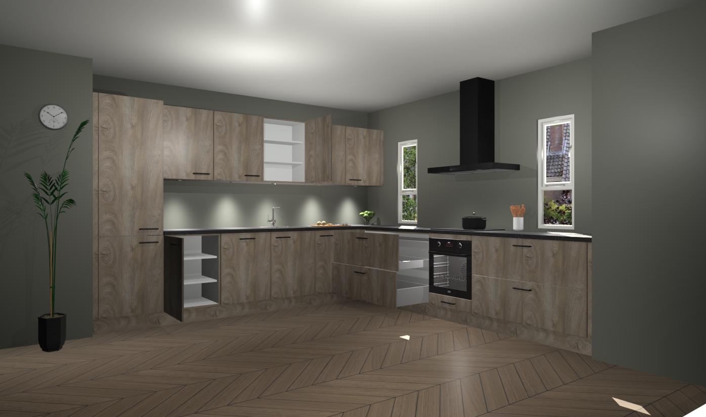 De cantaro eiken keuken is een ideale hoekkeuken en heeft alle functies en apparatuur die u maar nodig kunt hebben. Bij de bestelling krijgt u een oven, inductiekookplaat, afzuigkap, vaatwasser en koelkast - deze kunnen desgewenst eenvoudig worden uitgebreid naar AEG na bestellen. Elke kast wordt ook voor gemonteerd geleverd met soft close deuren die jarenlang gebruik beloven. Stelt u zich voor dat u geen gedoe heeft met vervelende montage - vanaf het moment dat u uw bestelling plaats, duurt het slechts 7 weken voor het bij u thuis geleverd wordt.
