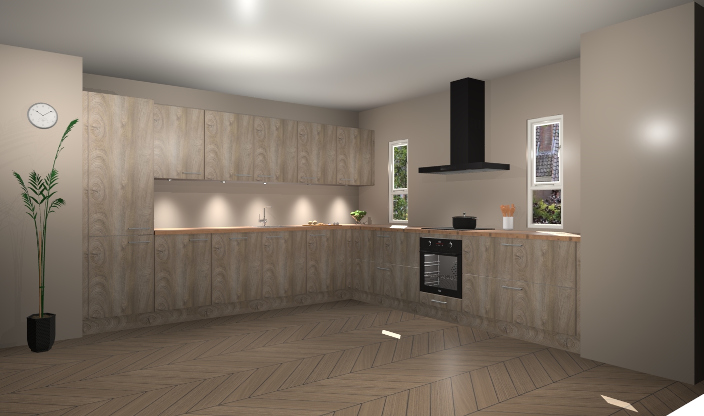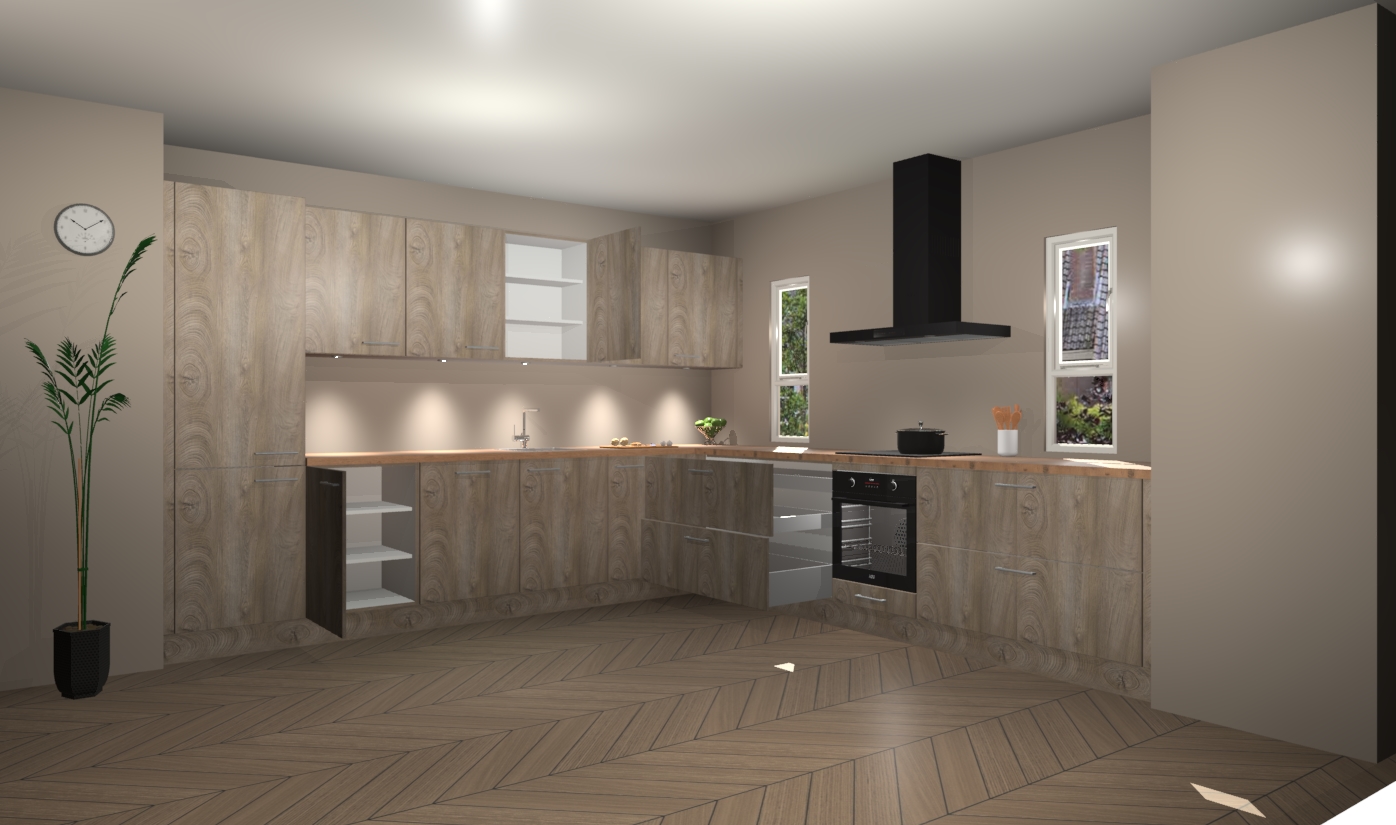 De cantaro eiken keuken is een ideale hoekkeuken en heeft alle functies en apparatuur die u maar nodig kunt hebben. Bij de bestelling krijgt u een oven, inductiekookplaat, afzuigkap, vaatwasser en koelkast - deze kunnen desgewenst eenvoudig worden uitgebreid naar AEG na bestellen. Elke kast wordt ook voor gemonteerd geleverd met soft close deuren die jarenlang gebruik beloven. Stelt u zich voor dat u geen gedoe heeft met vervelende montage - vanaf het moment dat u uw bestelling plaats, duurt het slechts 7 weken voor het bij u thuis geleverd wordt.