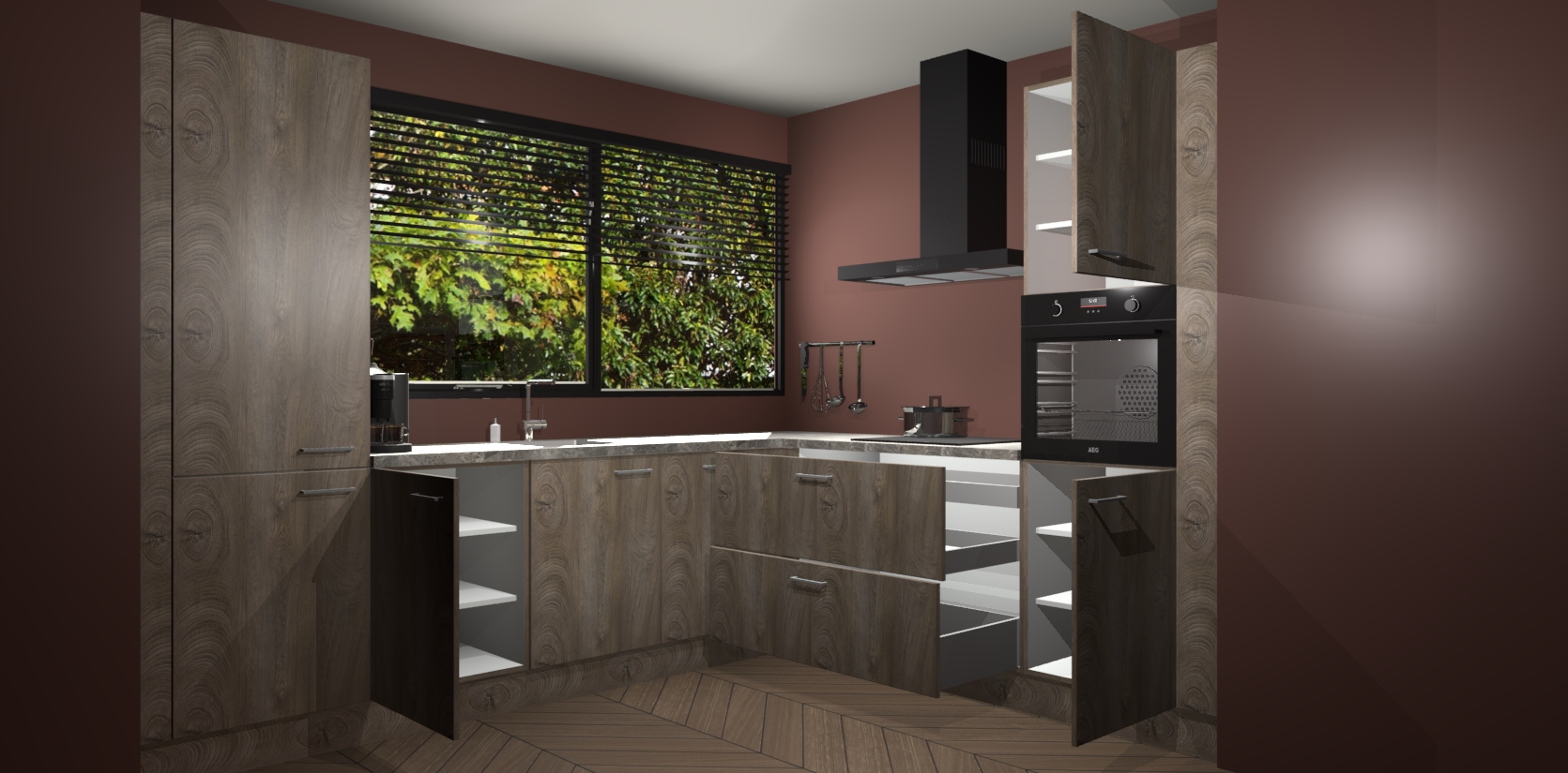 Met een modern, tijdloos design en ruime opslagruimte, zult u zich in no-time thuis voelen in uw nieuwe keuken. Uw leven wordt eenvoudiger met de soft-close deuren die voor het ultieme stille comfort zorgen - geen geluid dat u stoort terwijl u kookt. Ook is de keuken voorzien van 5 ingebouwde apparaten: een oven, inductie kookplaat, afzuigkap, vaatwasser en koelkast. Deze kunnen gemakkelijk na bestelling worden bijgewerkt naar AEG - waardoor uw luxe ervaring compleet is.