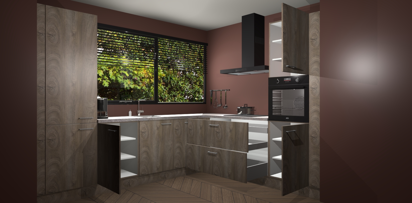 Met een modern, tijdloos design en ruime opslagruimte, zult u zich in no-time thuis voelen in uw nieuwe keuken. Uw leven wordt eenvoudiger met de soft-close deuren die voor het ultieme stille comfort zorgen - geen geluid dat u stoort terwijl u kookt. Ook is de keuken voorzien van 5 ingebouwde apparaten: een oven, inductie kookplaat, afzuigkap, vaatwasser en koelkast. Deze kunnen gemakkelijk na bestelling worden bijgewerkt naar AEG - waardoor uw luxe ervaring compleet is.