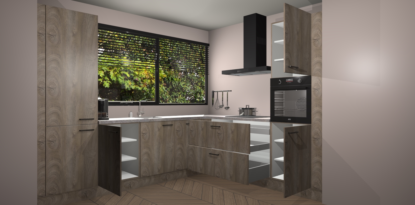 Met een modern, tijdloos design en ruime opslagruimte, zult u zich in no-time thuis voelen in uw nieuwe keuken. Uw leven wordt eenvoudiger met de soft-close deuren die voor het ultieme stille comfort zorgen - geen geluid dat u stoort terwijl u kookt. Ook is de keuken voorzien van 5 ingebouwde apparaten: een oven, inductie kookplaat, afzuigkap, vaatwasser en koelkast. Deze kunnen gemakkelijk na bestelling worden bijgewerkt naar AEG - waardoor uw luxe ervaring compleet is.